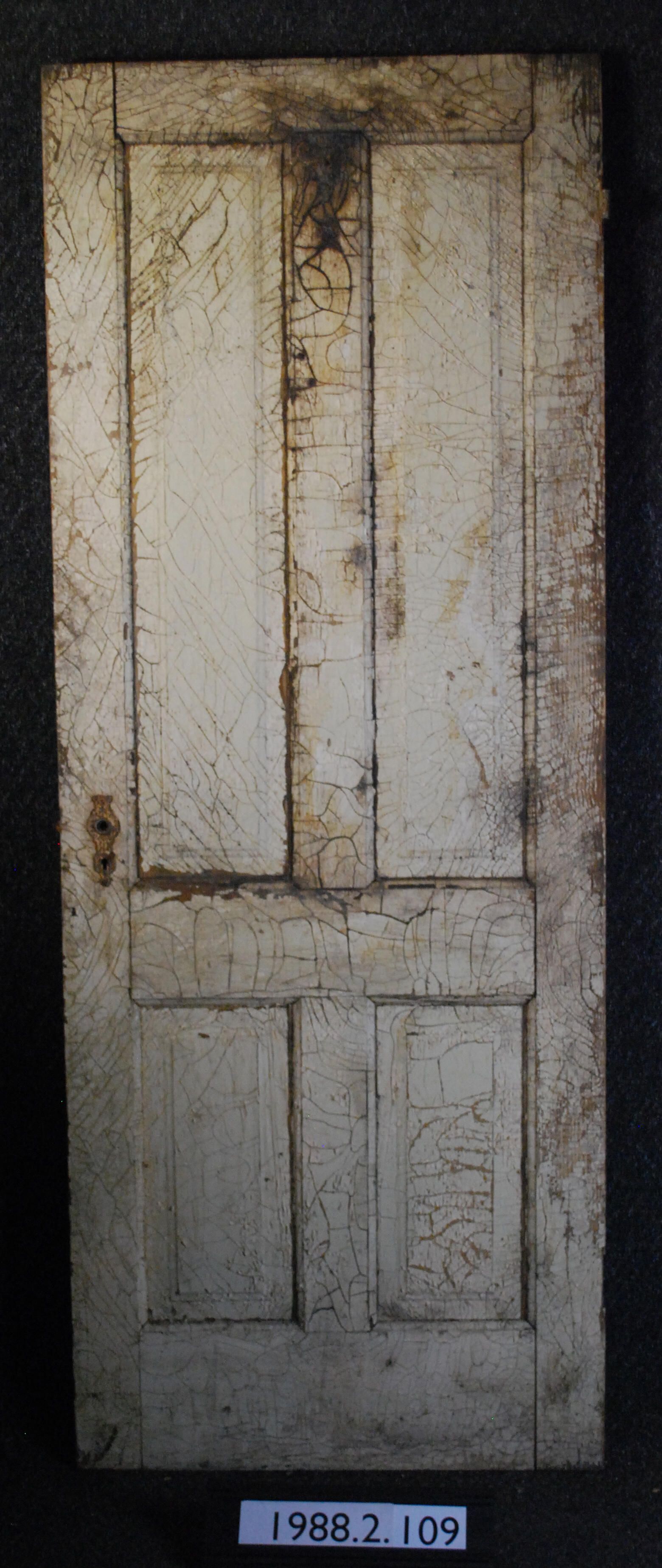 Interior door. Has mortice lock. Two escutcheon plates. Both knobs are missing. Has one incomplete hinge leaf. Other hinge is missing. Painted cream colored on one side and beige on opposite side.