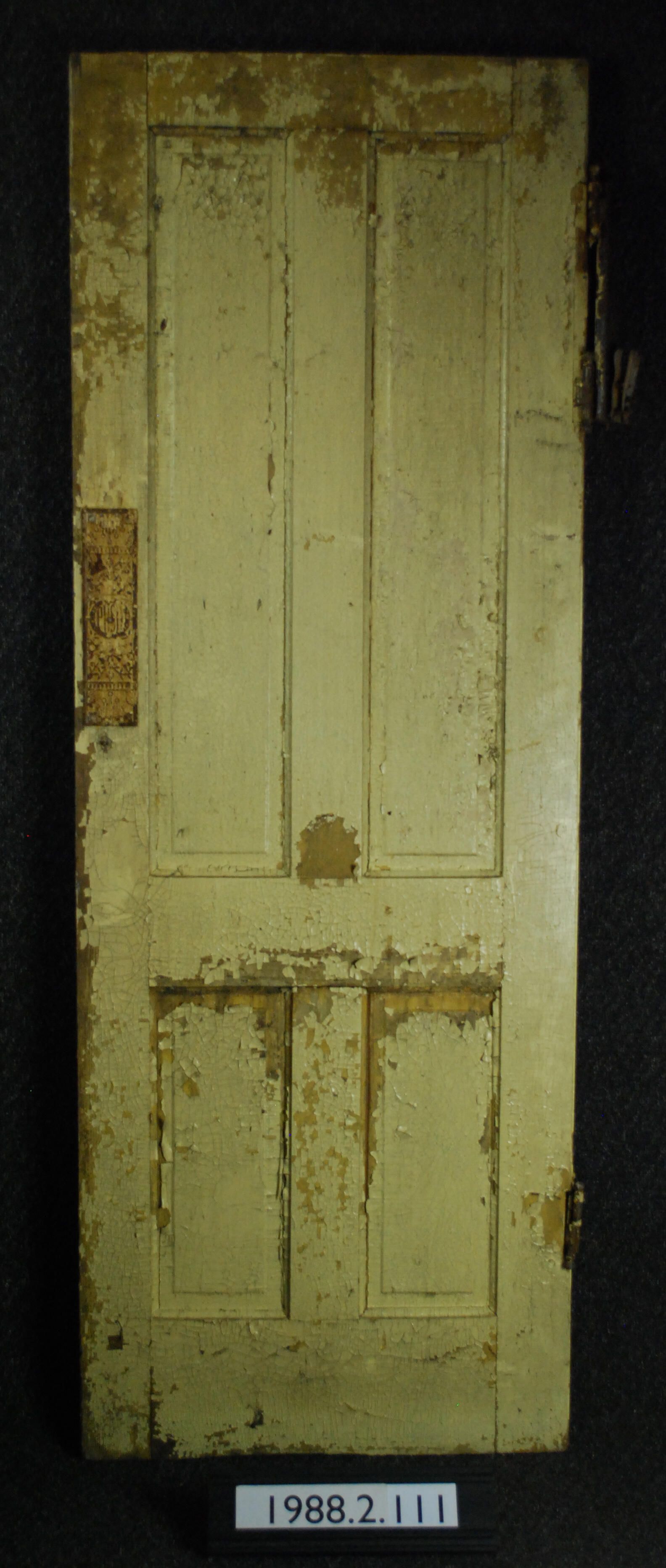 Interior door. Four panel. Has decorative cast iron push plate on each side. Has three hinges which swing in dual directions. Painted green. Inscriptions or Markings: Manufacturer: Place of Manufacturer: Design Motif: Style: Finish: Painted Green