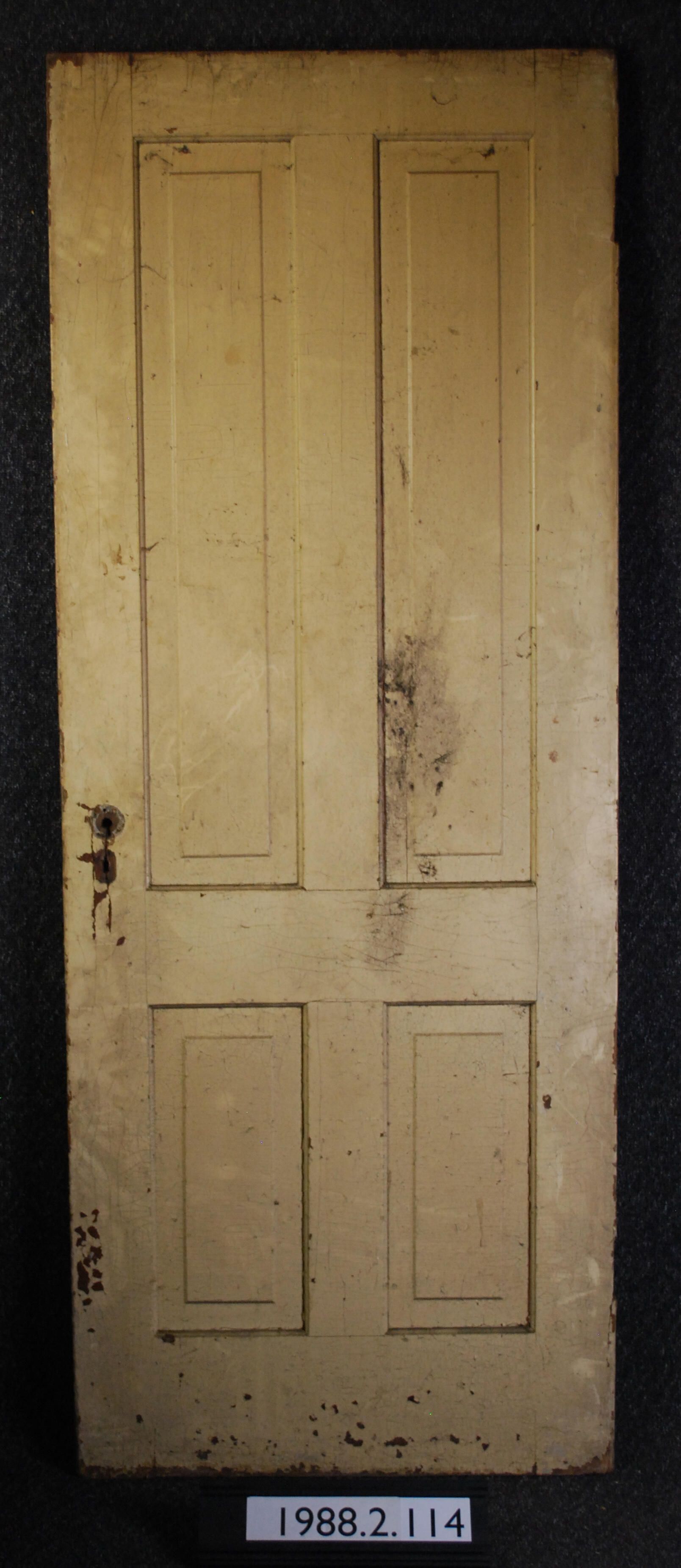 Interior door. Four panel. All hardware is missing (originally had rim lock). Painted yellow. Inscriptions or Markings: Manufacturer: Place of Manufacturer: Design Motif: Style: Finish: Painted Yellow