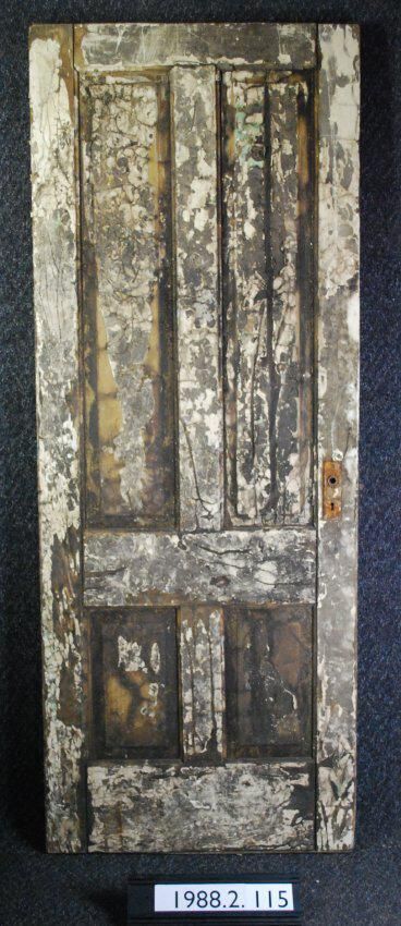 Interior door. Four panel. Has mortice lock. One escutcheon plate. Both hinges are missing. Painted yellow. Markings: Manufacturer: Place of Manufacturer: Design Motif: Style: Finish: Painted Yellow