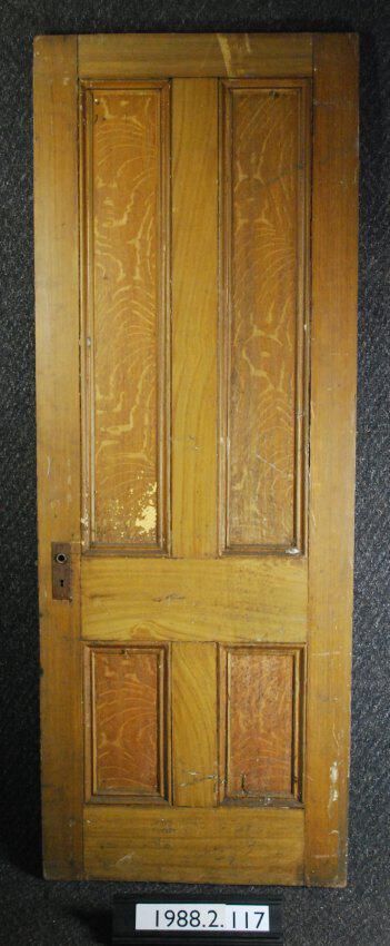 Interior door. Four panel, with applied moldings. Has mortice lock. Two escutcheon plates. Knobs are missing. Has two hinge leaves. Faux wood grained. Painted on both sides.