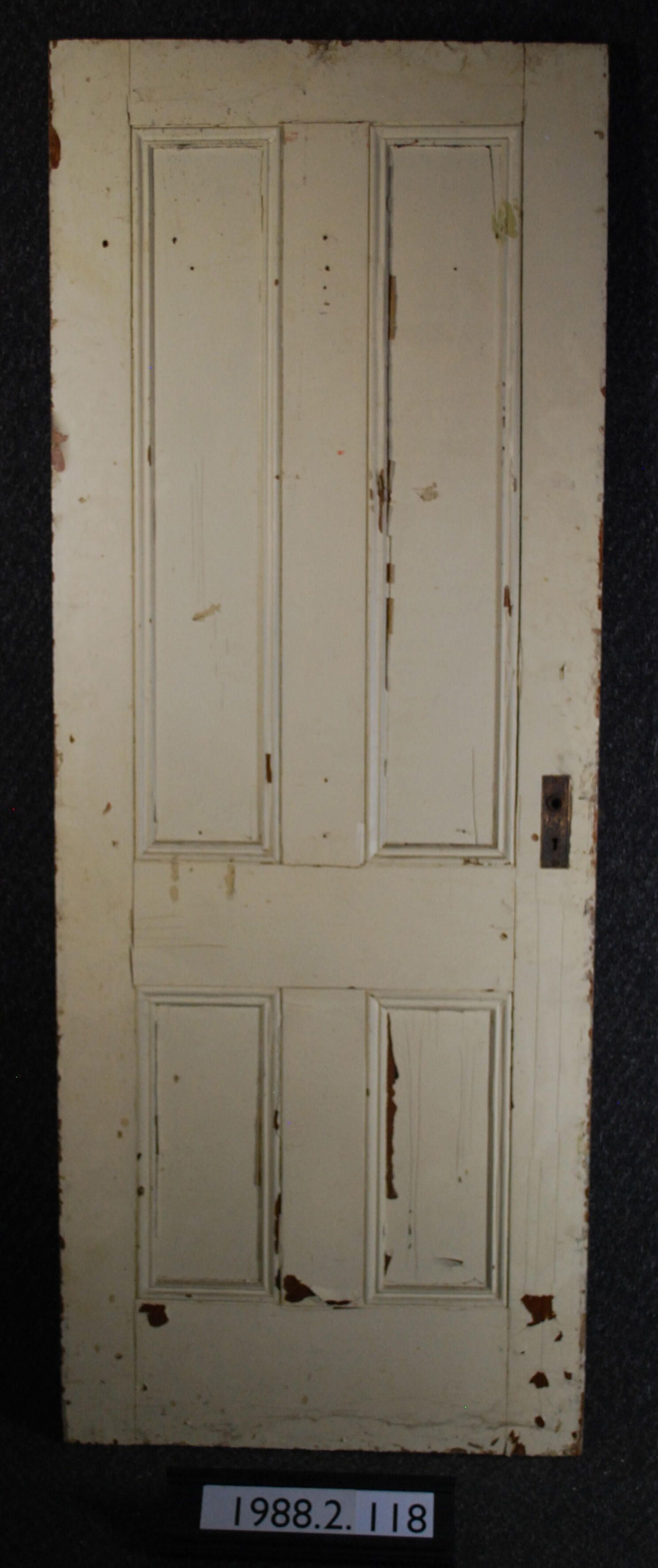 Interior door. Four panel, with applied moldings. Has mortice lock. One brass escutcheon plate. Other escutcheon plate is missing. Both knobs are missing. Hinges are missing. Painted cream colored on one side. Stripped on other side.