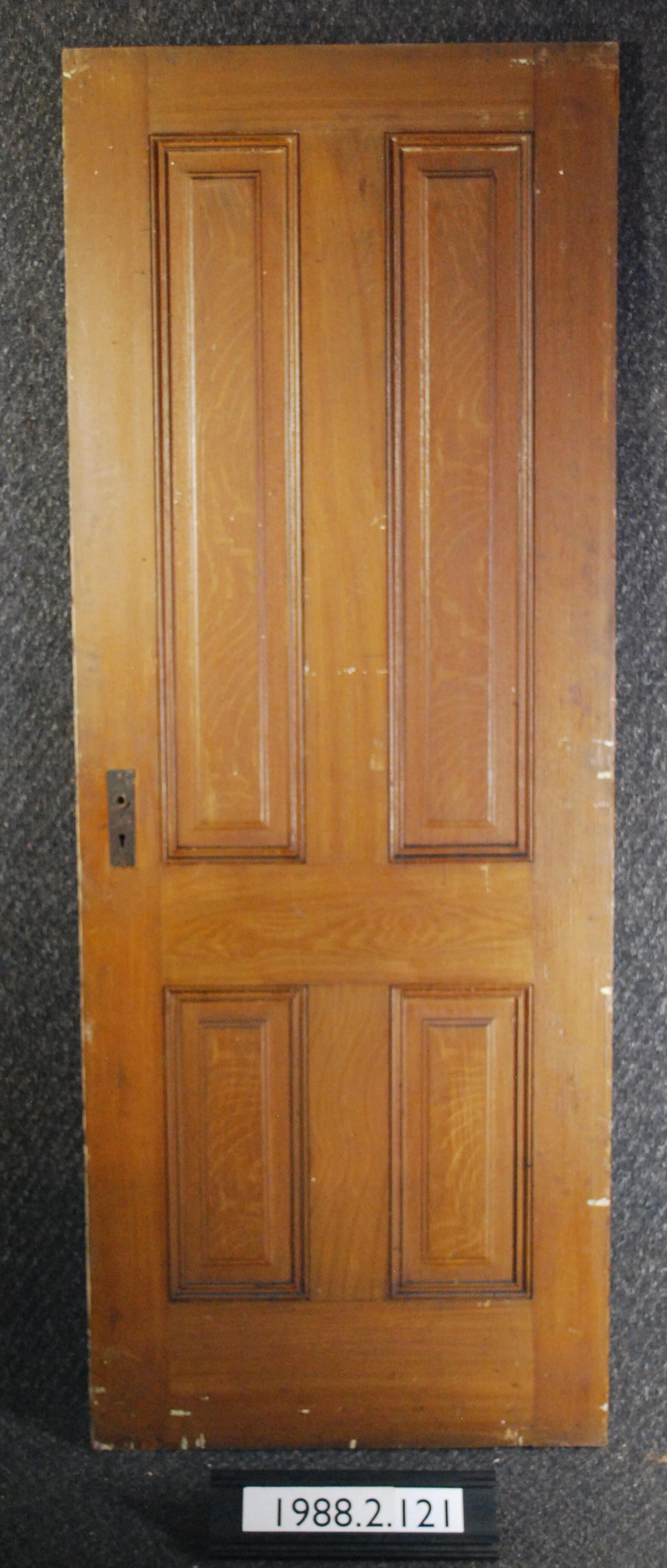 Interior door. Four panel, with applied moldings. Has mortice lock, two escutcheon plates. Both knobs are missing. Both hinges are missing. One side of door is painted tan. Other side is painted faux wood grained.