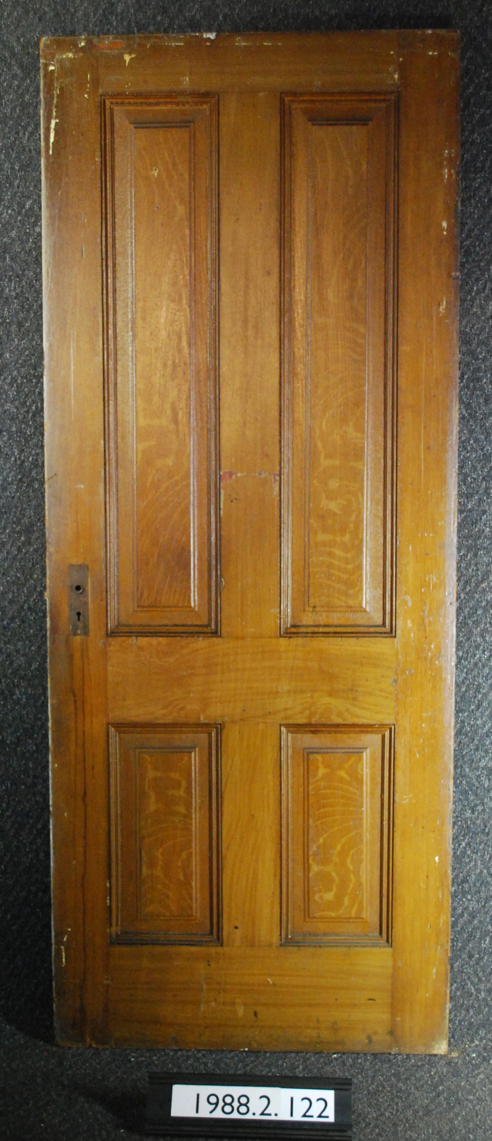Interior door. Four panel, with applied moldings. Has mortice lock. Two escutcheon plates. Both knobs are missing. Has one cast iron hinge leaf. Other hinge leaf is broken. incomplete. One side of door is painted cream / yellow. Other side is painted faux wood grained.