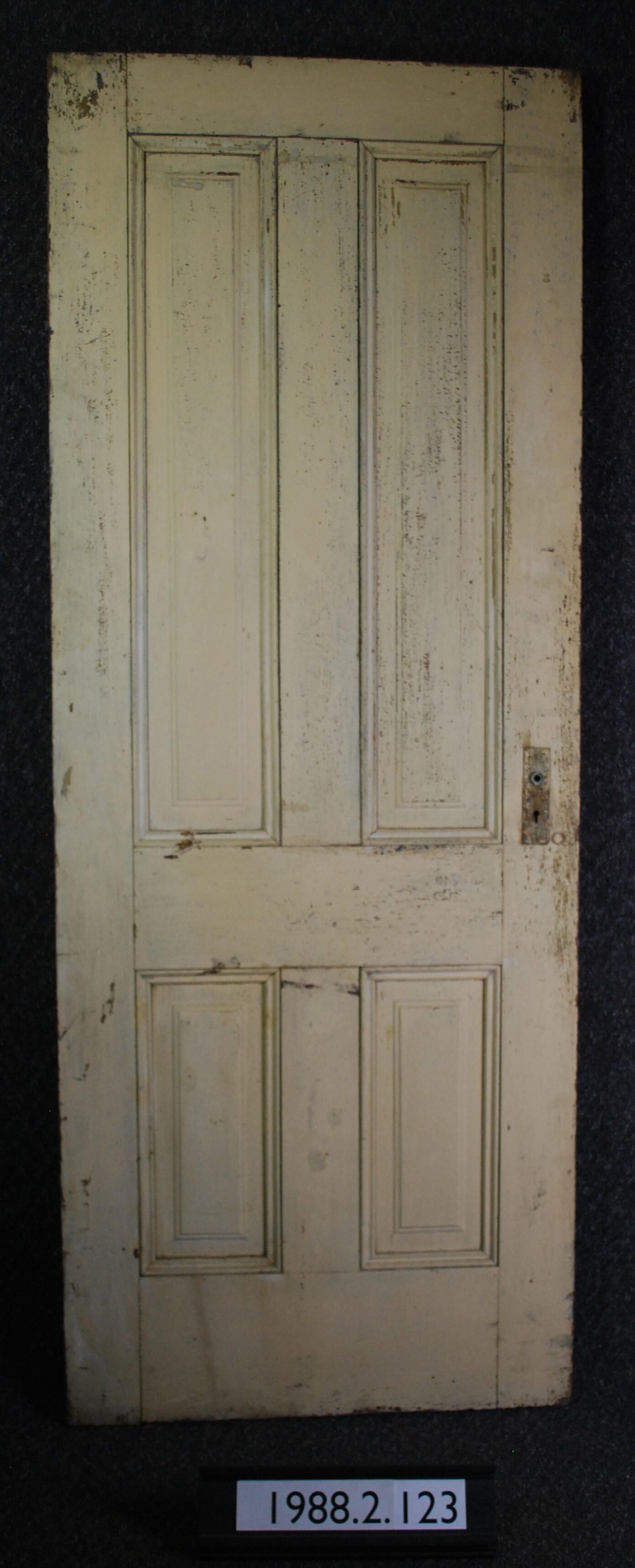 Interior door. Four panel, with applied moldings. Mortice lock is missing. Has escutcheon plates. Has two cast hinge leaves. Painted ivory colored on both sides.
