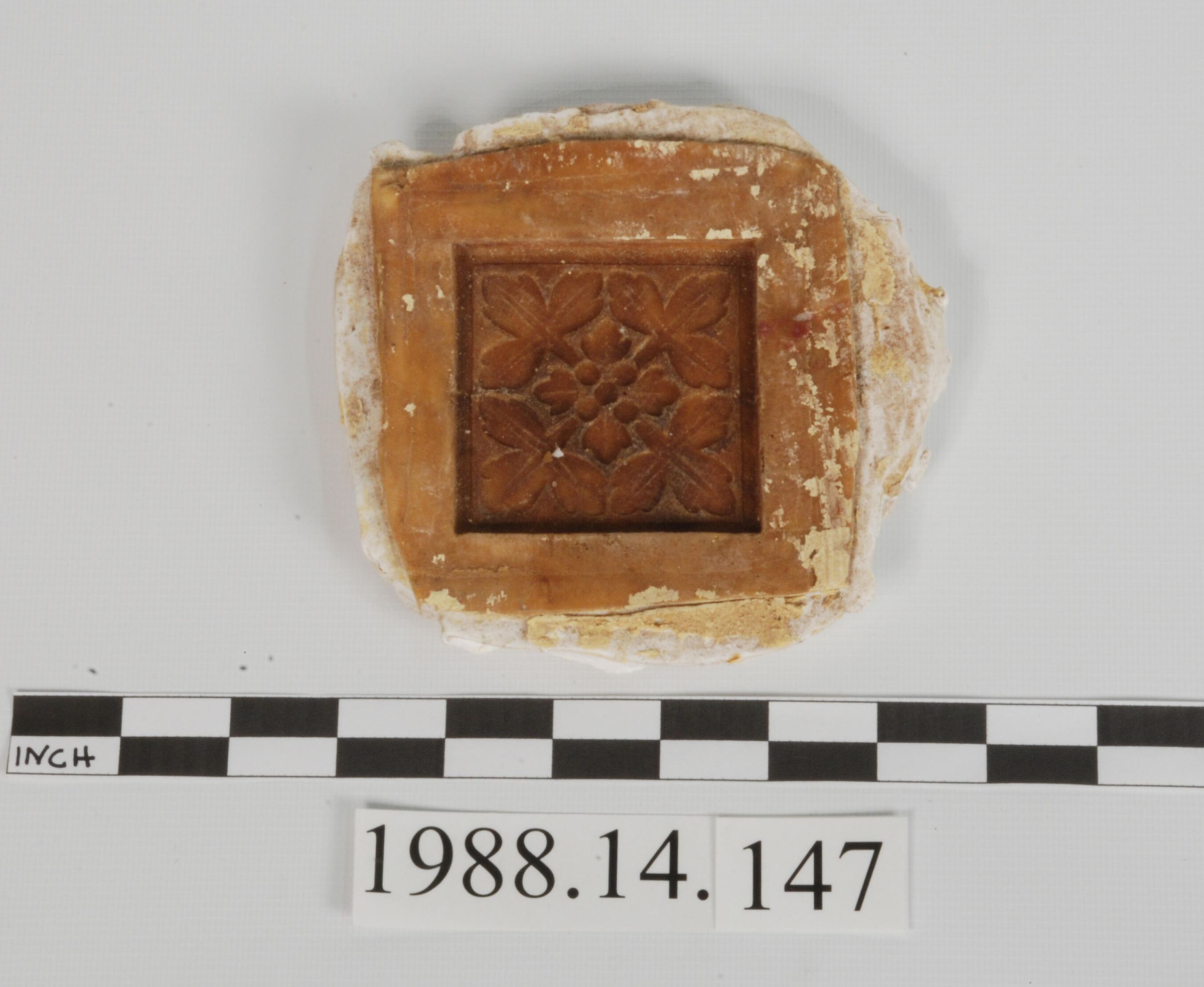 Rubber facing with mother mold to cast square flat block with symetrical leaf motif.