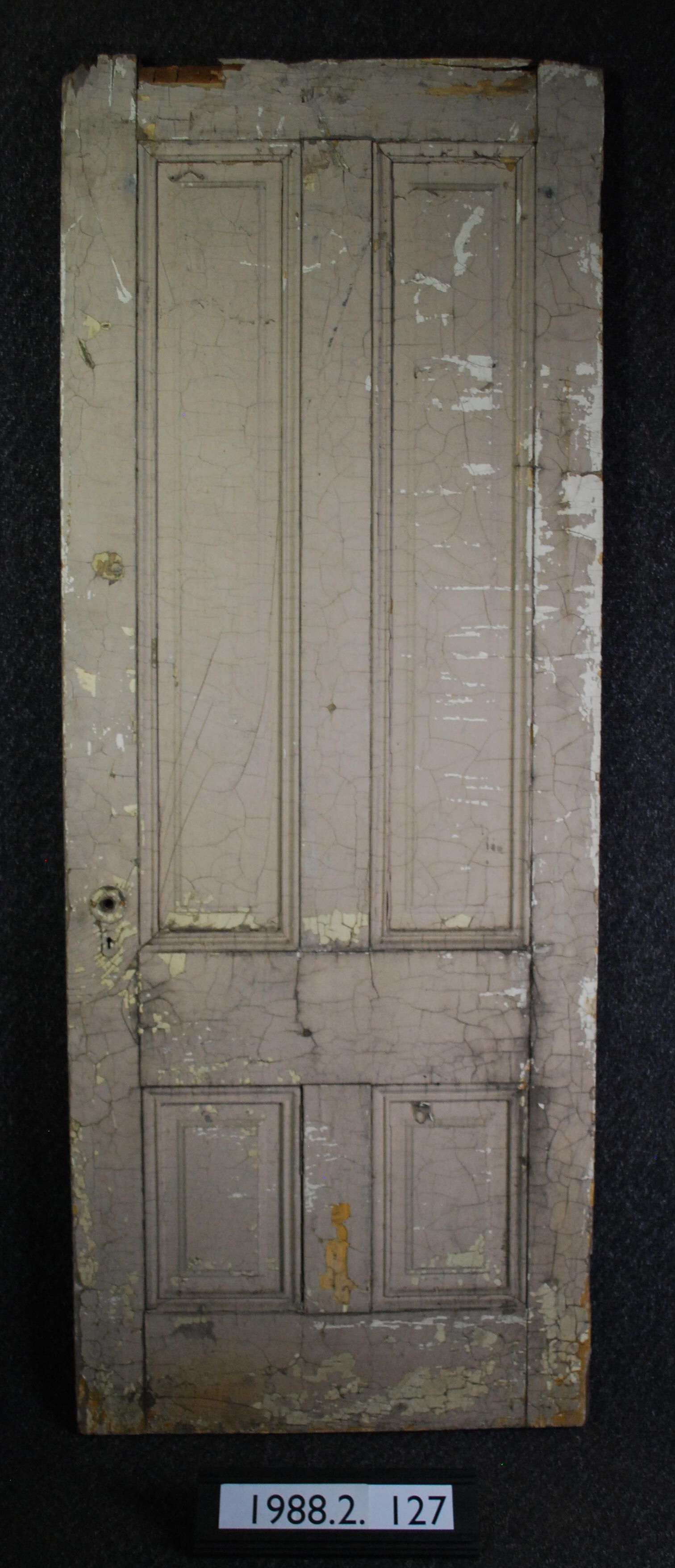 Interior door. Four panel, with applied moldings. Mortice lock. Two circular escutcheon plates. Keyhole escutcheon. Both hinges missing. Top of door rotten. Painted beige.