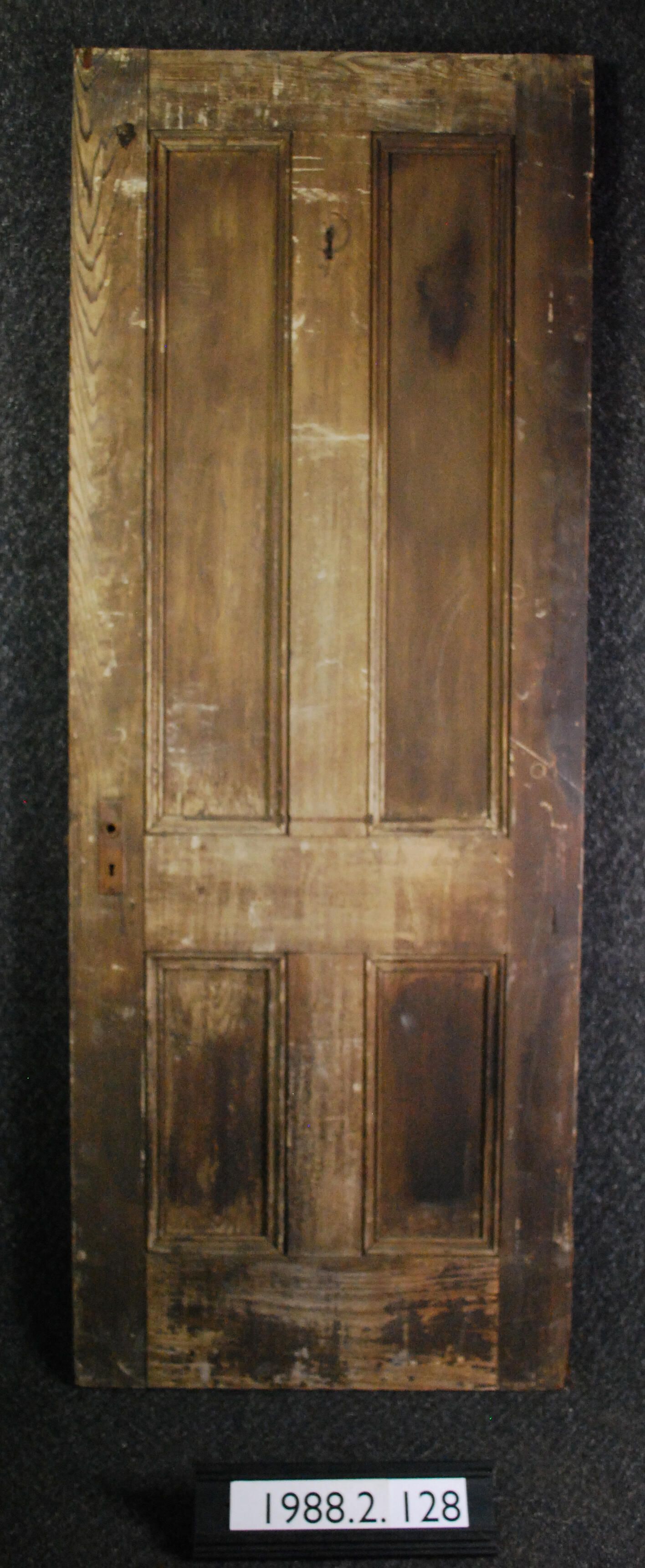 Interior door. Four panel, with applied moldings. Has mortice lock, two escutcheon plates. Hinges are missing. Varnished. Markings: Manufacturer: Place of Manufacturer: Design Motif: Style: Finish: Varnished
