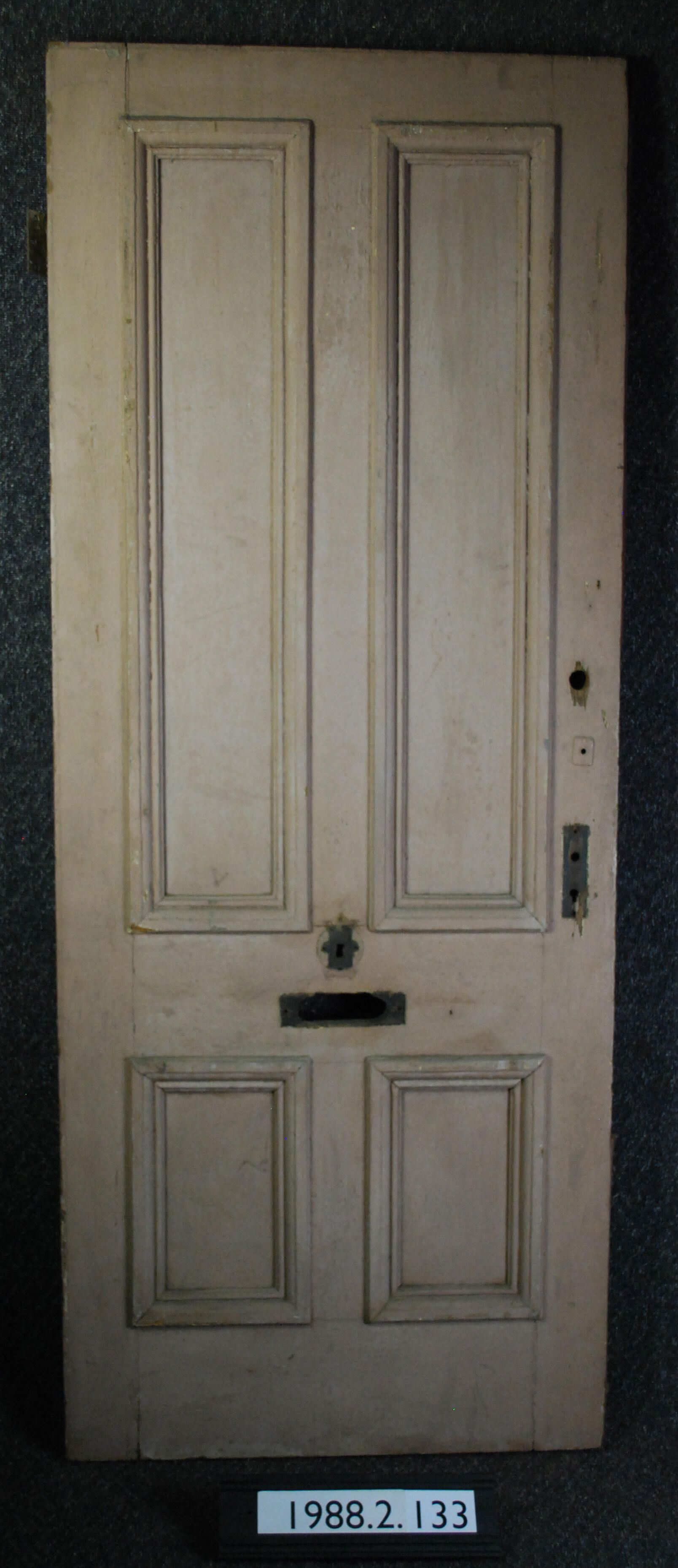 Exterior door. Four panels. Applied moldings. Bolection moldings on one side. Mortice lock. Door bell and later rim locks missing. Has two later hinges. Painted brown.