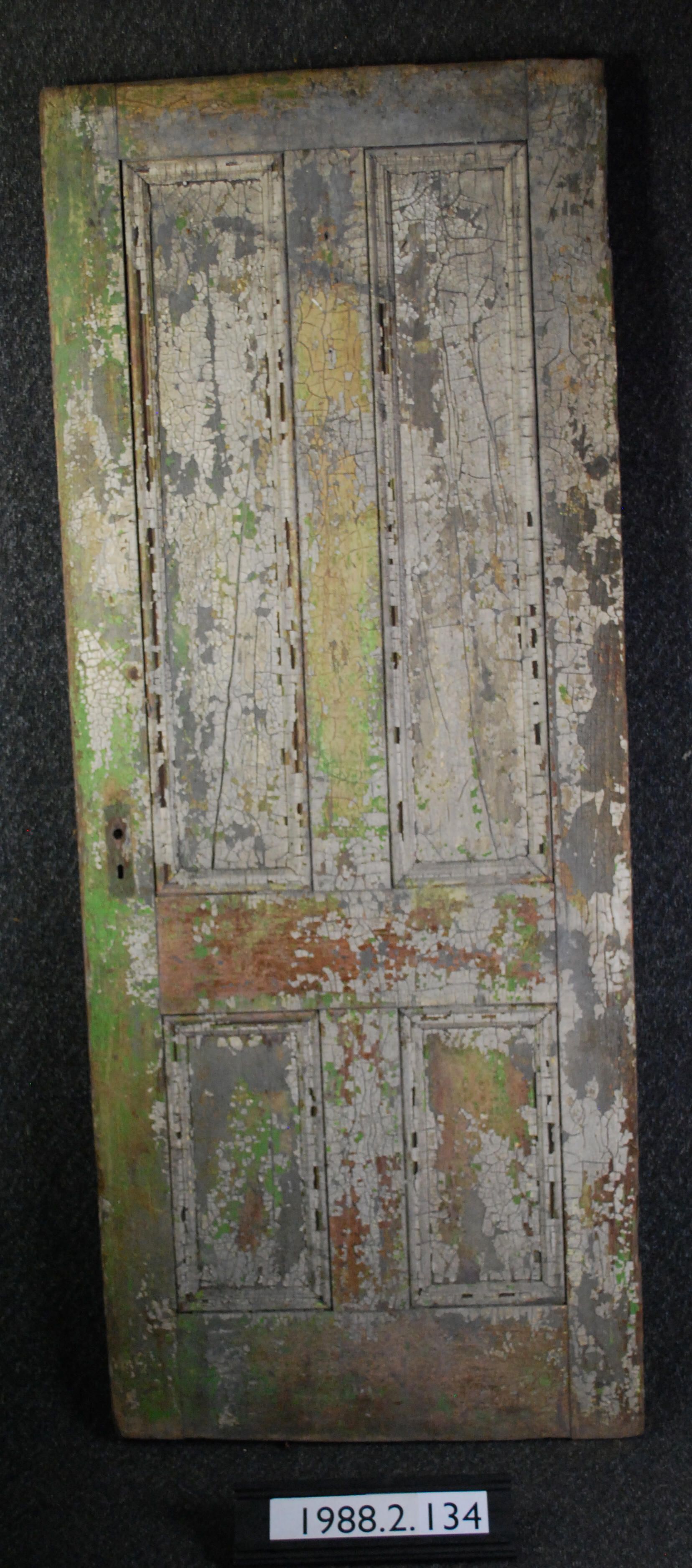 Exterior door. Four panels. Applied moldings. Has mortice lock and one escutcheon plate. All other hardware is missing. Moldings missing on one side. Multiple layers of peeling paint.