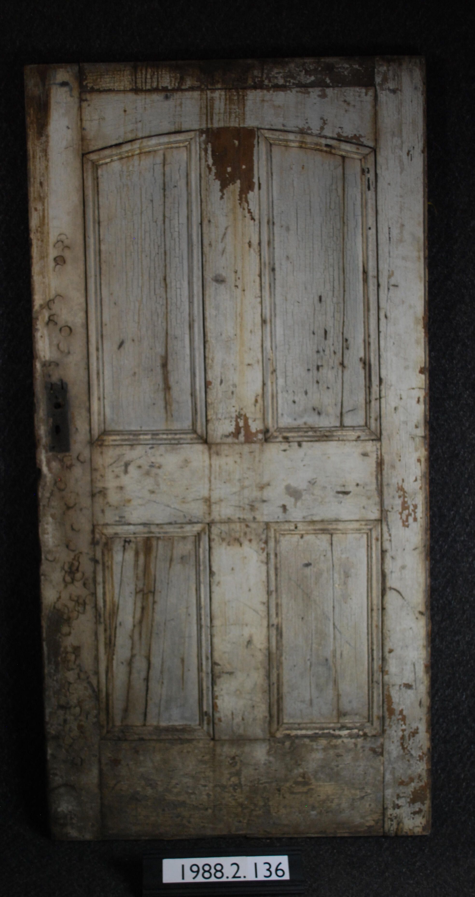 Exterior door. Four panels. Applied moldings. Upper panels arched. Has mortice lock. One back plate. Two fixed joint hinge leaves. One broken loose joint hinge. Painted Green on one side. Varnished on other side.