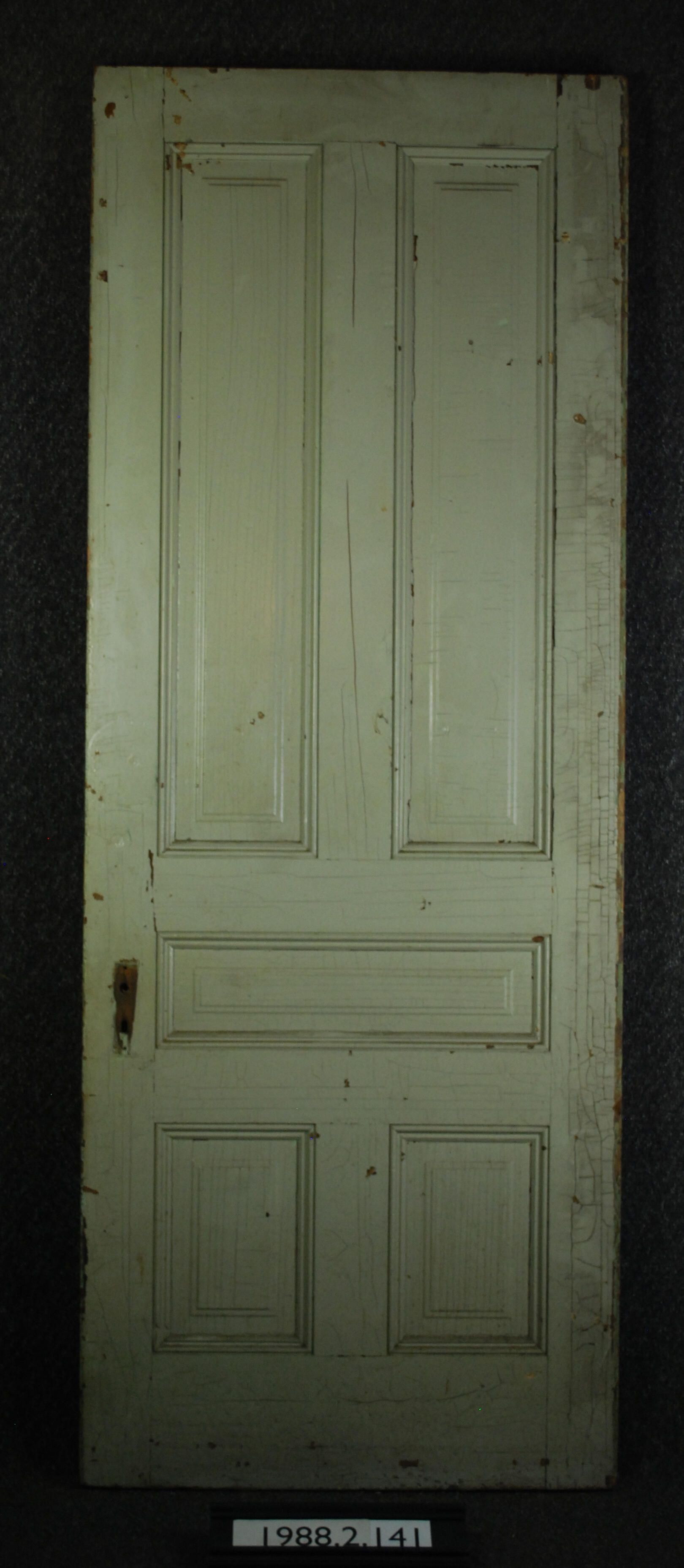 Exterior/interior door. Five panels. Applied moldings. Has mortice lock. Two hinge leaves. Other hardware is missing. Painted green. Markings: Manufacturer: Place of Manufacturer: Design Motif: Style: Finish: Painted Green