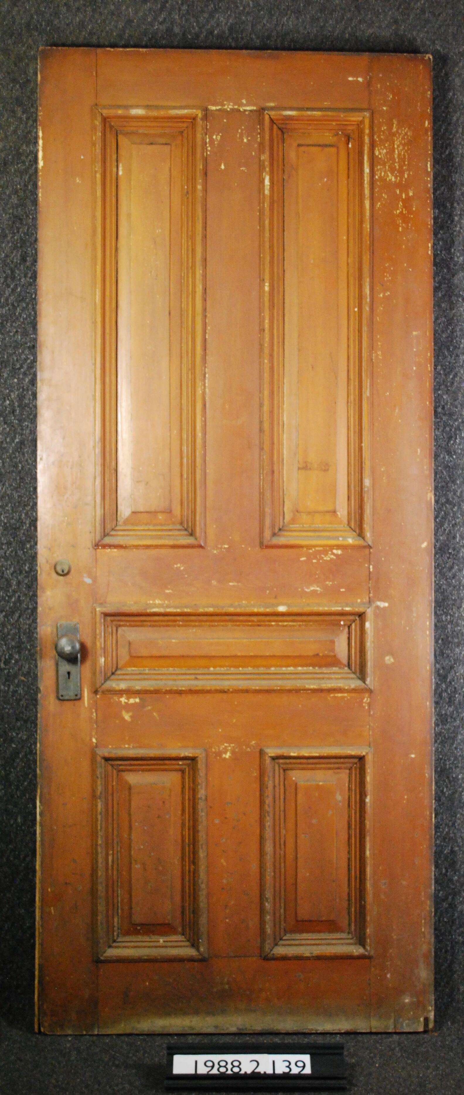 Exterior/interior door. Five panels. Applied bolection moldings on both sides. Has mortice lock (ornate brass edge). Later cylinder lock. Has three hinge leaves. Painted faux wood grained on both sides.