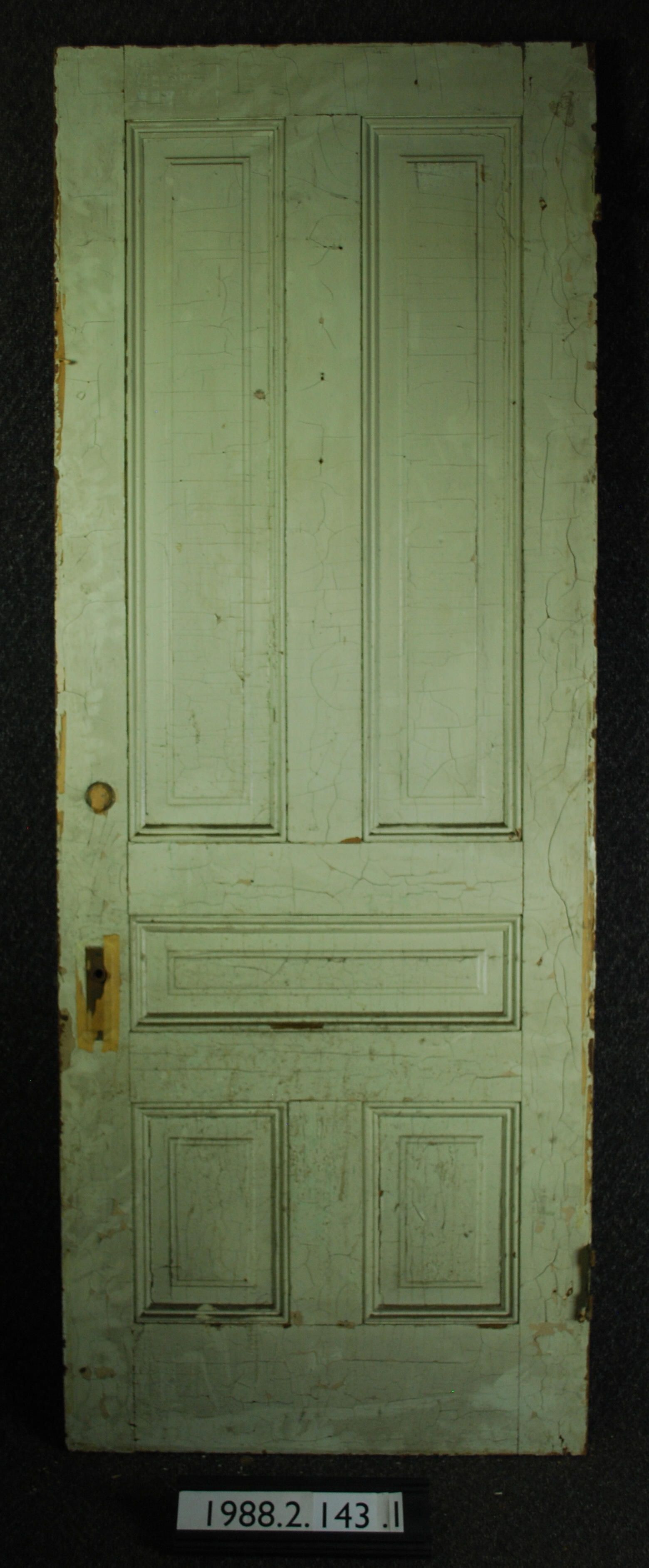 Exterior/interior door. Five panels, applied moldings. Has mortice lock, two brass escutcheon plates, two brass hinge leaves, Later rim lock with cylinder. Painted green.