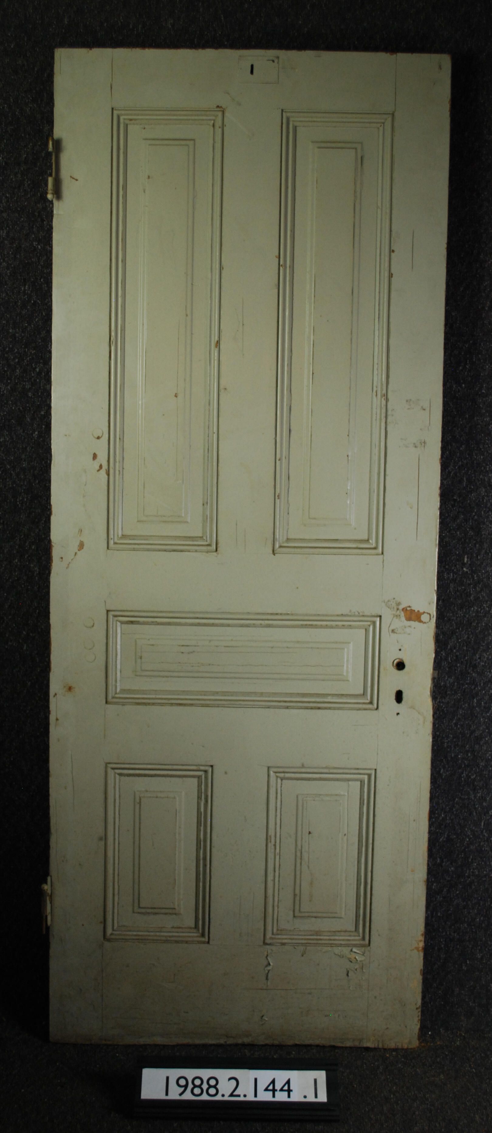Interior door. Five panels, applied moldings. Has mortice lock, two brass hinge leaves. All other hardware is missing. Painted green on one side, varnished on the other side.