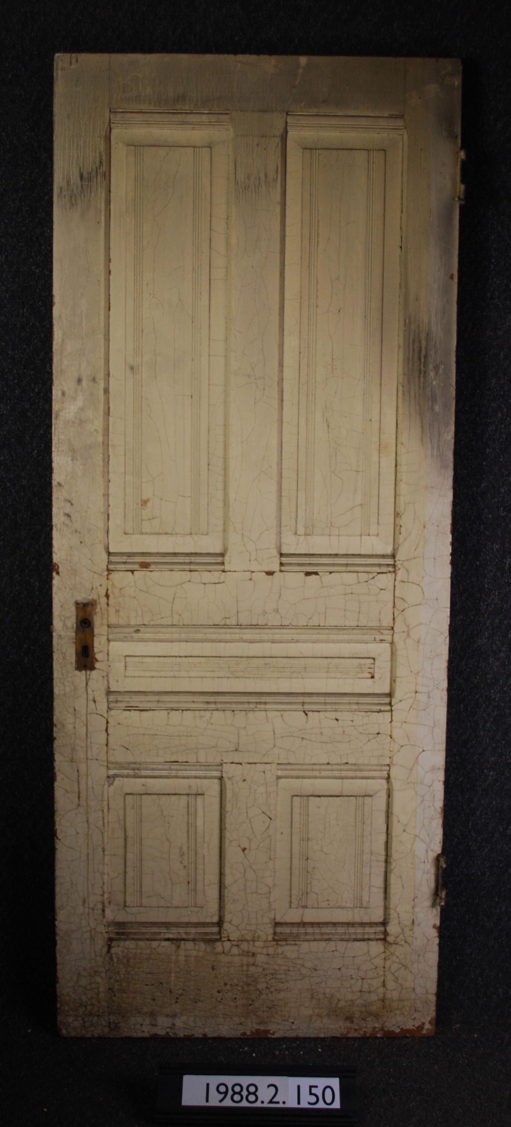 Exterior/interior door. Five panels, applied moldings. Has mortice lock, two cast iron hinge leaves. All other hardware is missing. Painted cream colored / tan.