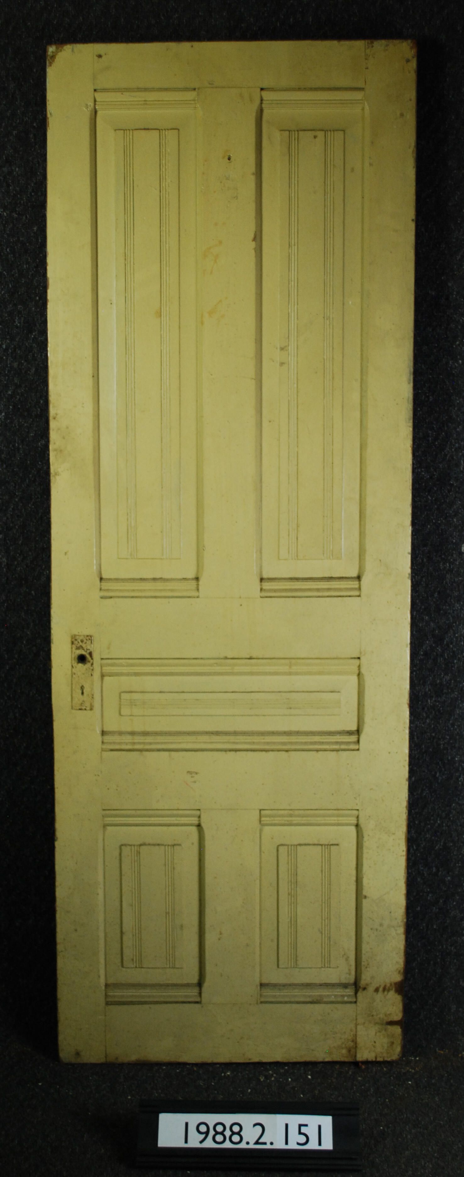 Interior door. Five panels, applied moldings. Has mortice lock, two escutcheon plates, two hinge leaves (one is broken - incomplete). Painted cream / tan.