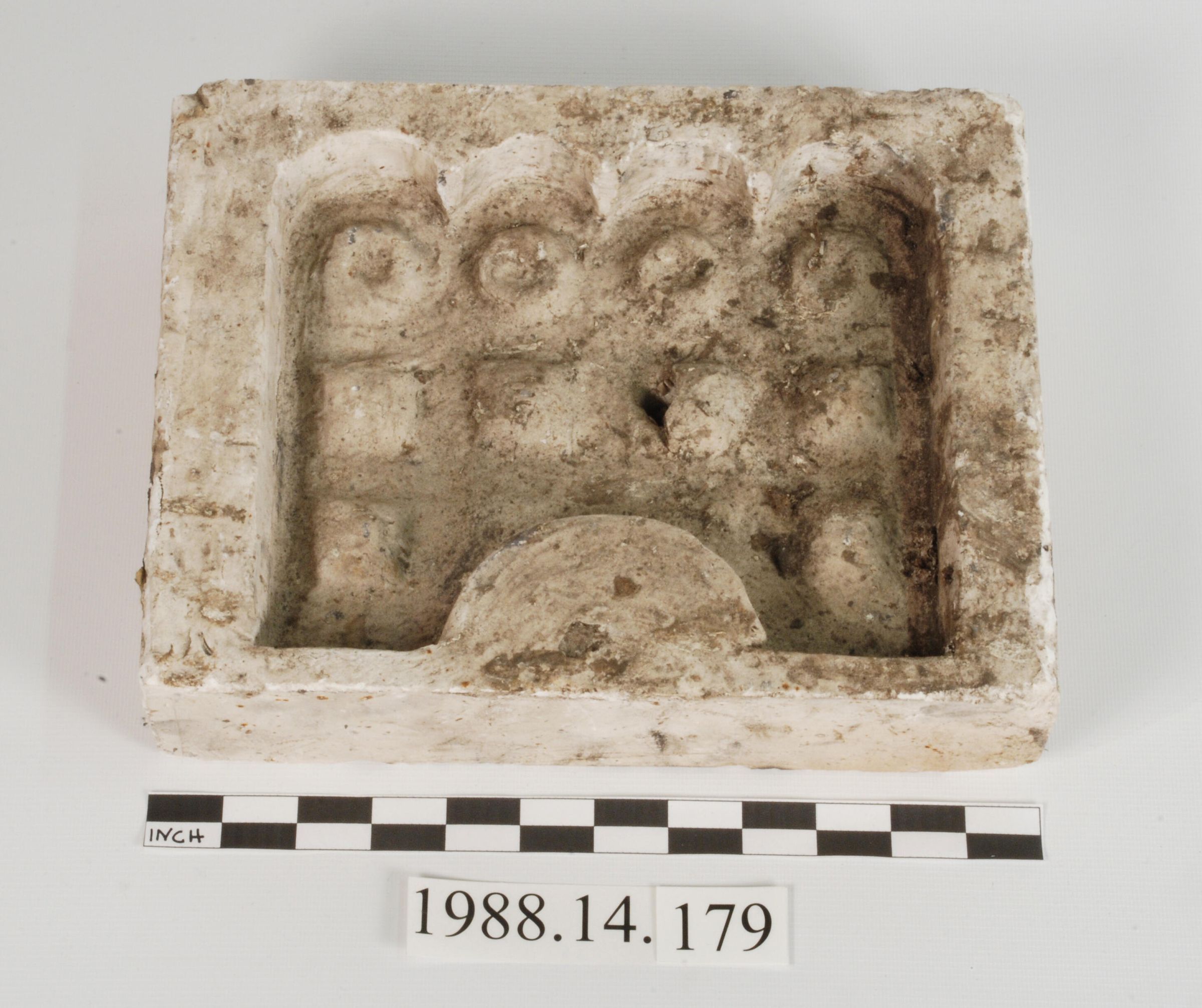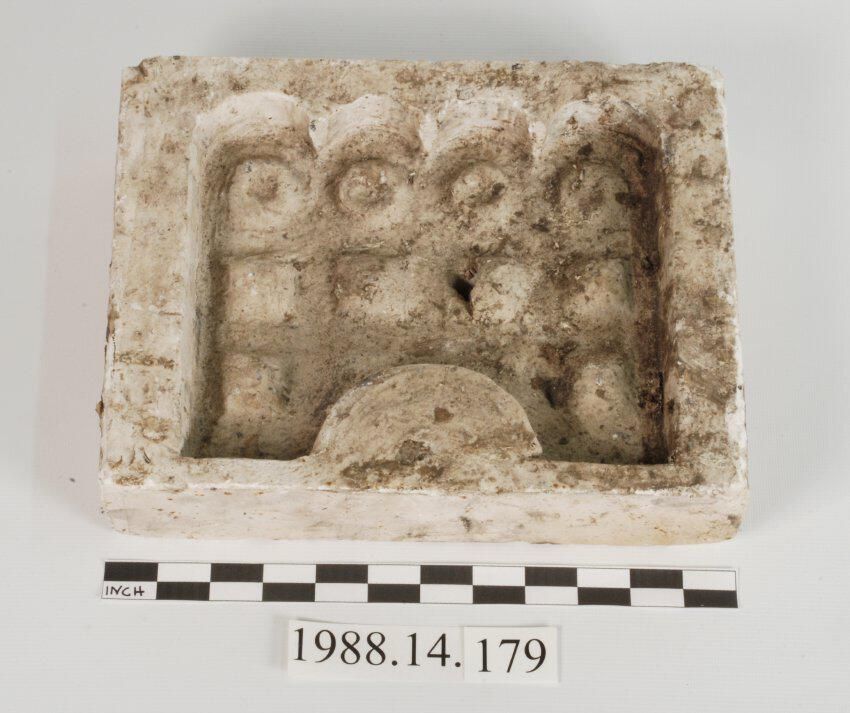Mother mold only. Rectantgular block to cast flat block with geometric motif. One edge scalloped. Other edge has half circle indent.