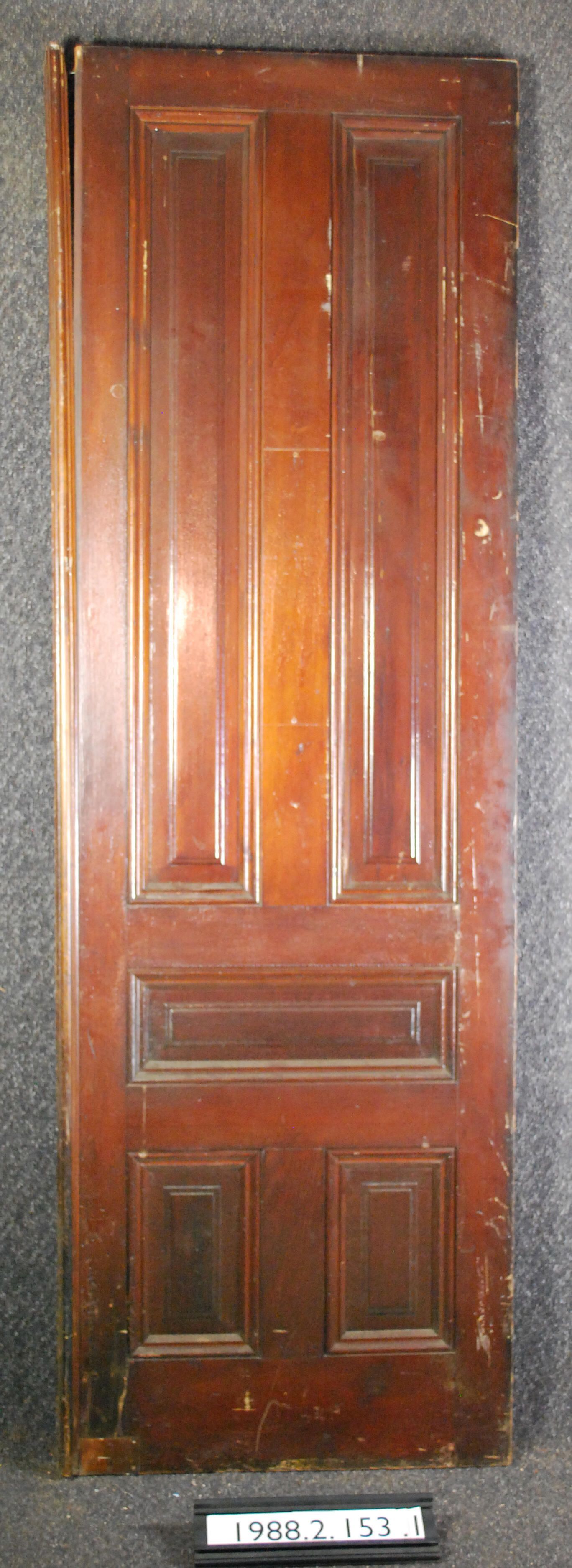Interior door, one of matched pair. Five panels, applied moldings, astragal molding on one side. Mortice lock is missing, has two vertical sliding bolts, both hinges are missing. Varnished.