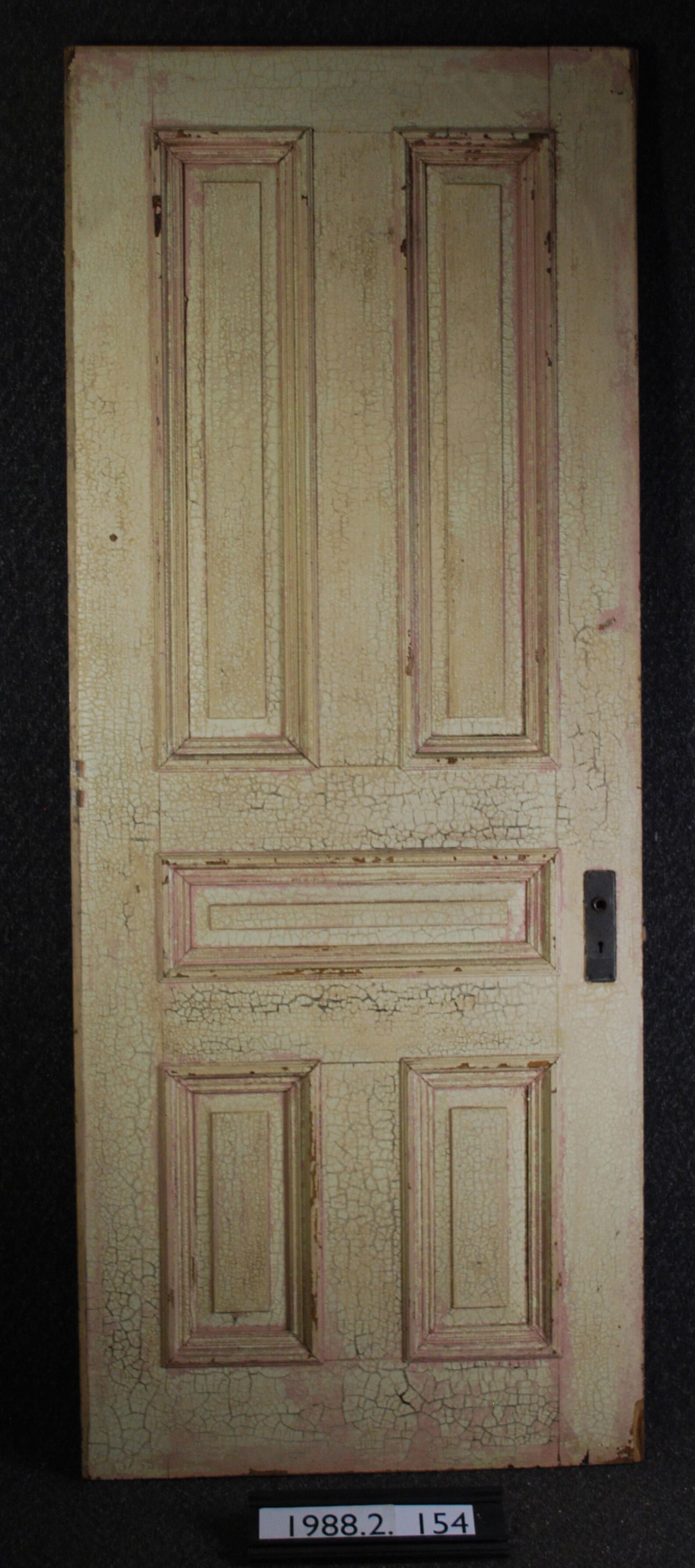Exterior/interior door. Five panels, applied moldings (one missing). Molding glued on veneer. Has two hinge leaves, mortice lock, two escutcheon plates. Originally varnished - now painted yellow / green.