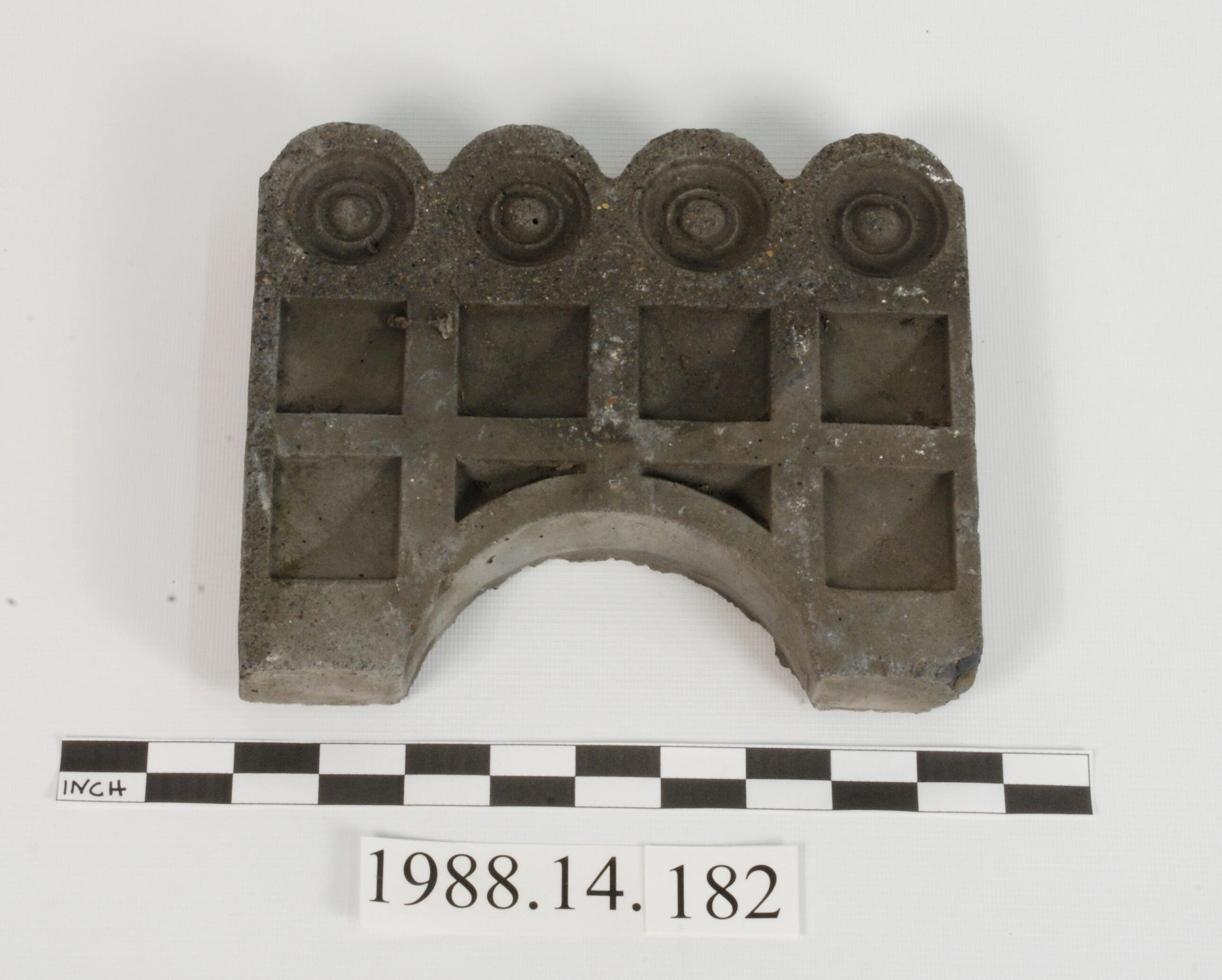 Reproduction molded cement. Flat rectangular block with geometric motif. One edge scalloped. The other edge has half circle indent. Tinted grey.