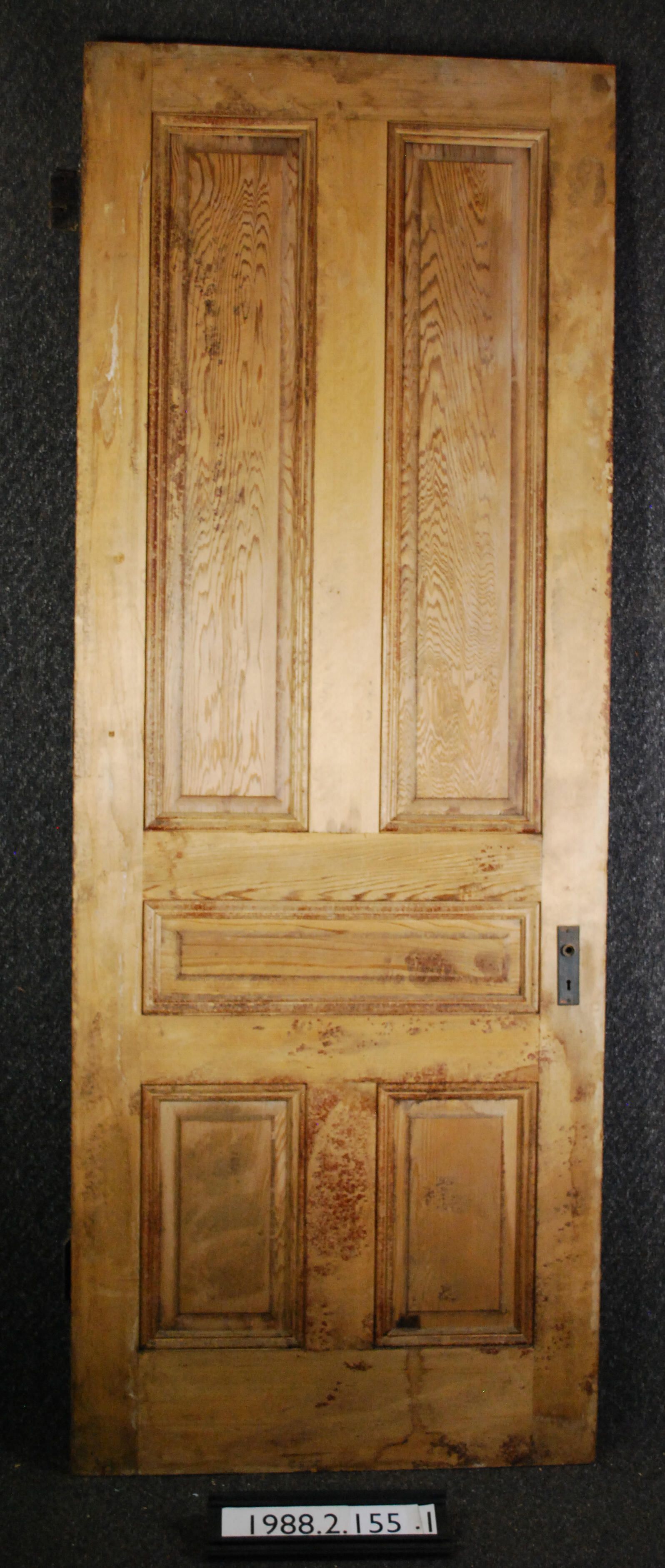 Exterior/interior door. One of matched pair. Five panels, applied moldings. Mortice lock missing. Has three hinges, two back plates, stripped of finish. Markings: Manufacturer: Place of Manufacturer: Design Motif: Style: Finish: Stripped