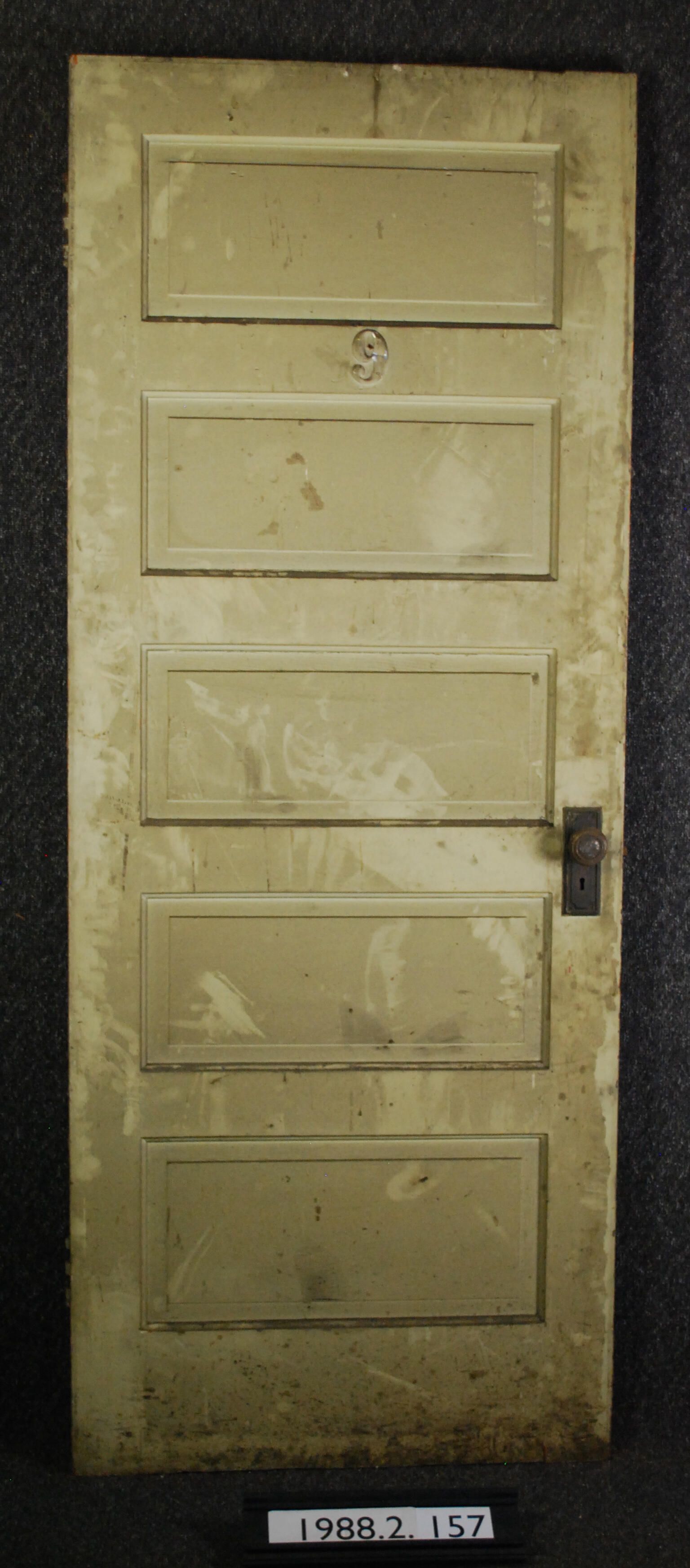 Interior door. (?Apartment or hotel building?). Five panels, mortice lock, two back plates, two door knobs, two hinge leaves, metal numeral 9. Painted green on one side, painted brown on the other side.