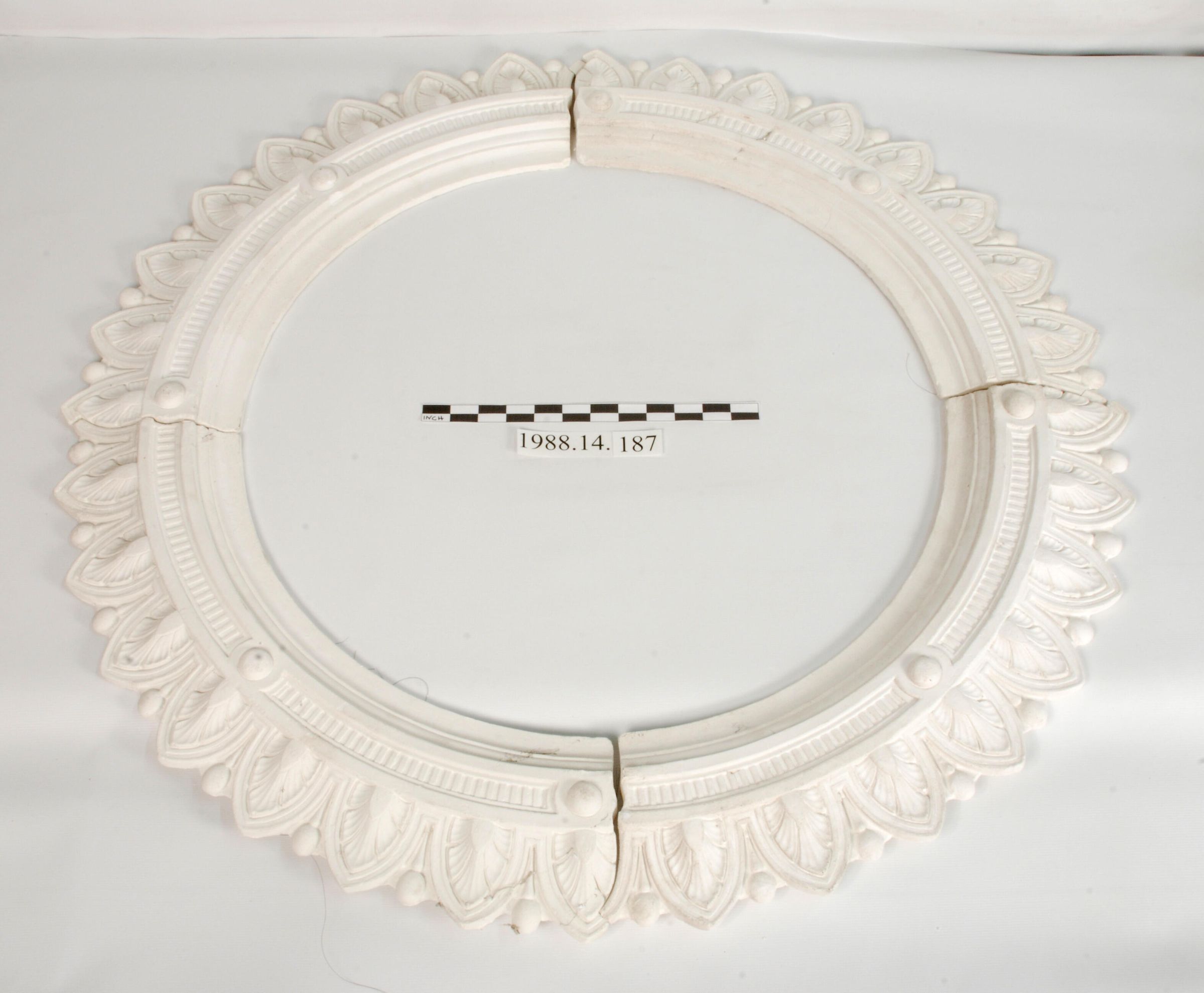 Reproduction molded plaster. Four semi-circular segments. Outer edge has series of shield-shaped appendages with alternating beads. Has dentil and bead band. (Some missing pieces).