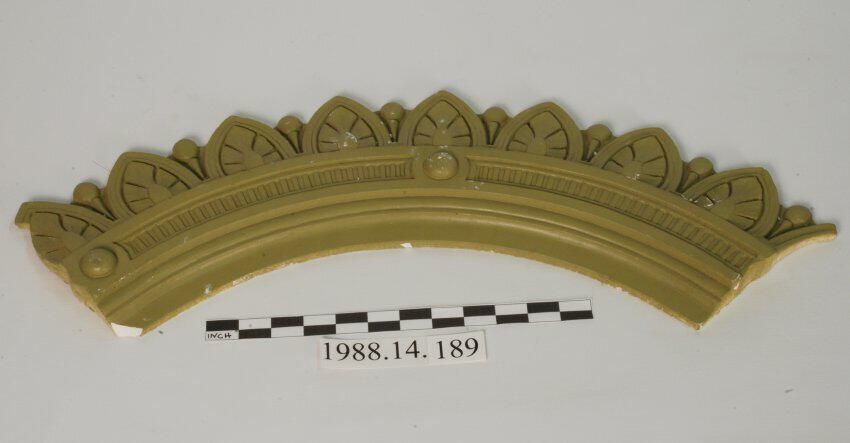 Reproduction molded plaster. One semi-circular segment. Outer edge has series of shield-shaped appendages with alternating beads. Has dentil and bead band. Painted olive green.