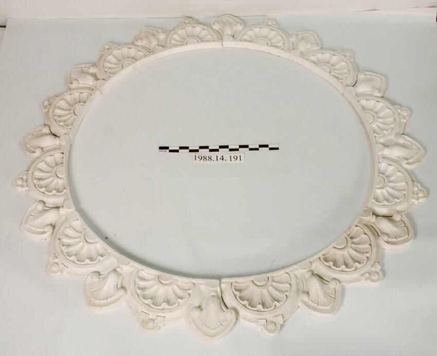 Reproduction molded plaster. Six semi-circular segments, together compose a complete circular surround. Scallopped and alternating shield-shaped appendages around perimeter. (Some broken segments).