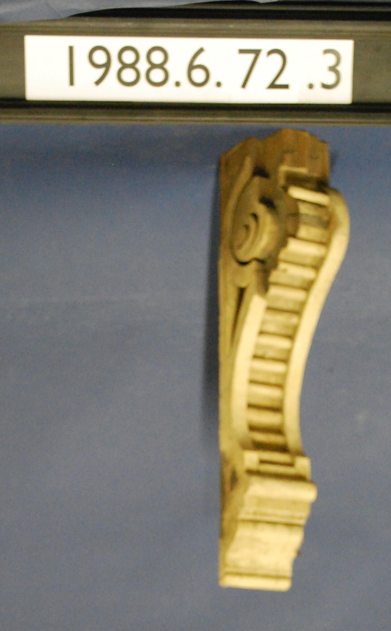 Wood bracket. Scrolled sides. Ribbed ornament on front. Painted beige. Inscriptions or Markings: Manufacturer: Place of Manufacturer: Design motif: Style: Finish: Painted