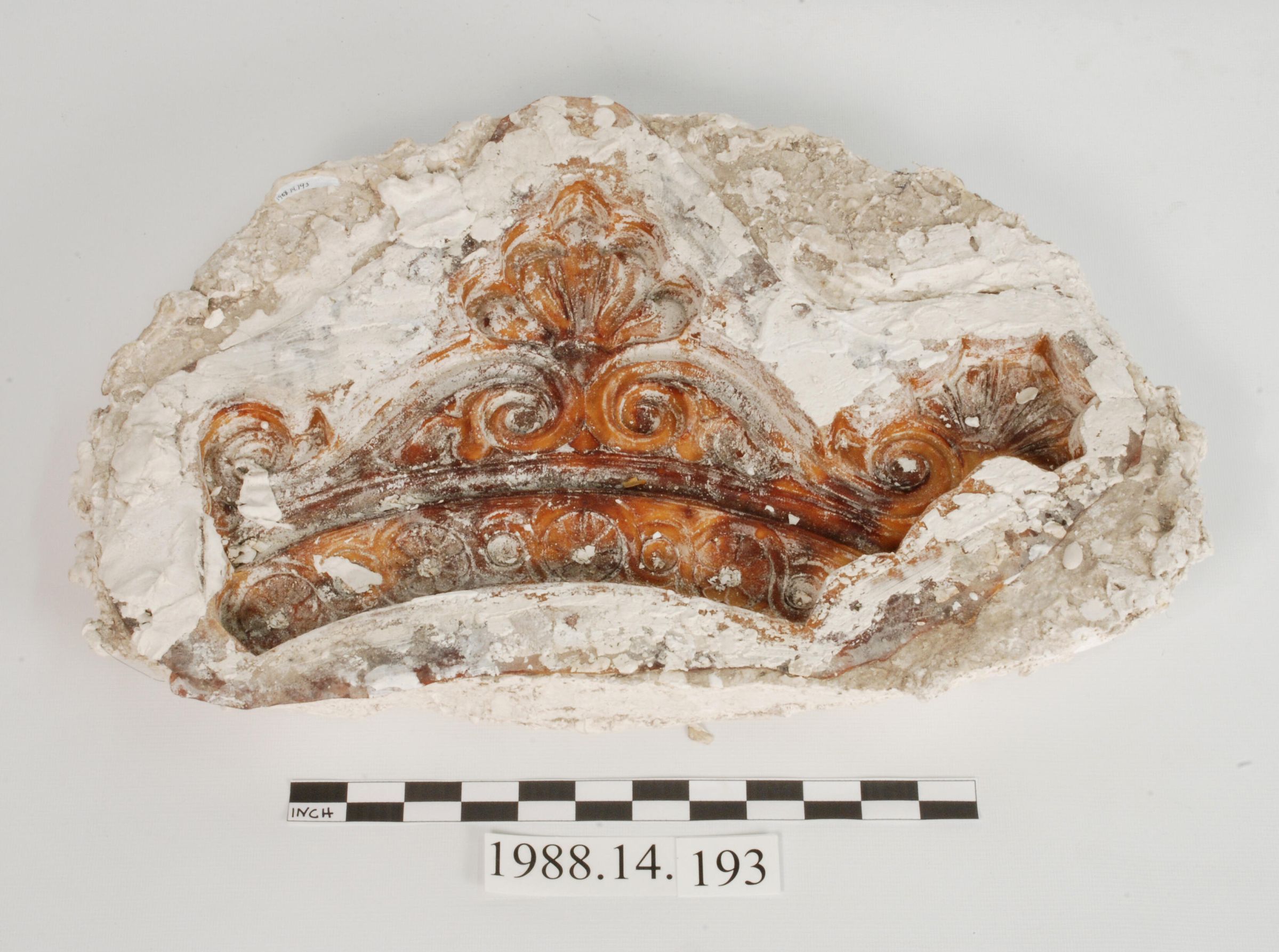 Rubber facing with plaster mother mold to cast semi-circular surround segment. Design has scroll with stylized foliation, rosettes and twisted band motif.