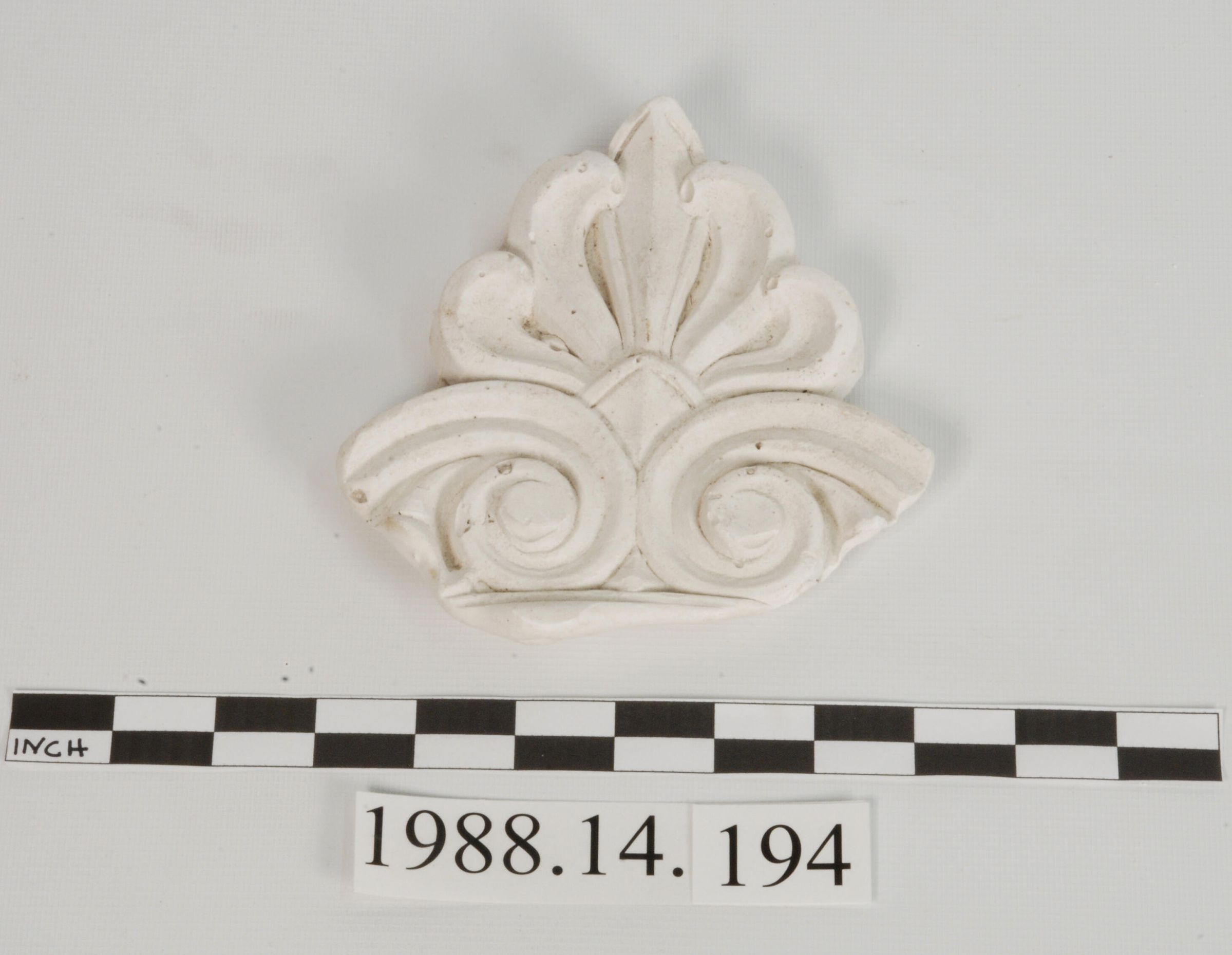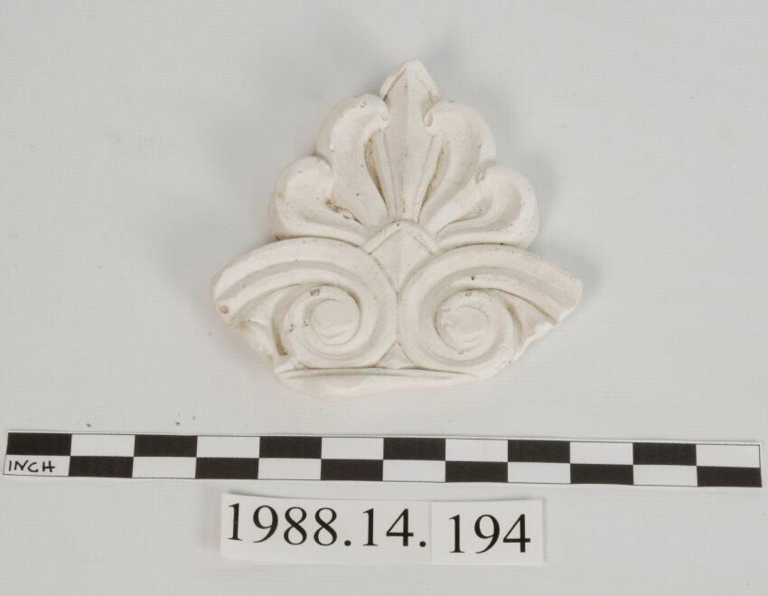 Reproduction molded plaster. Decorative element derived from ceiling surround. See 1988.14.192. Scroll / leaf motif.
