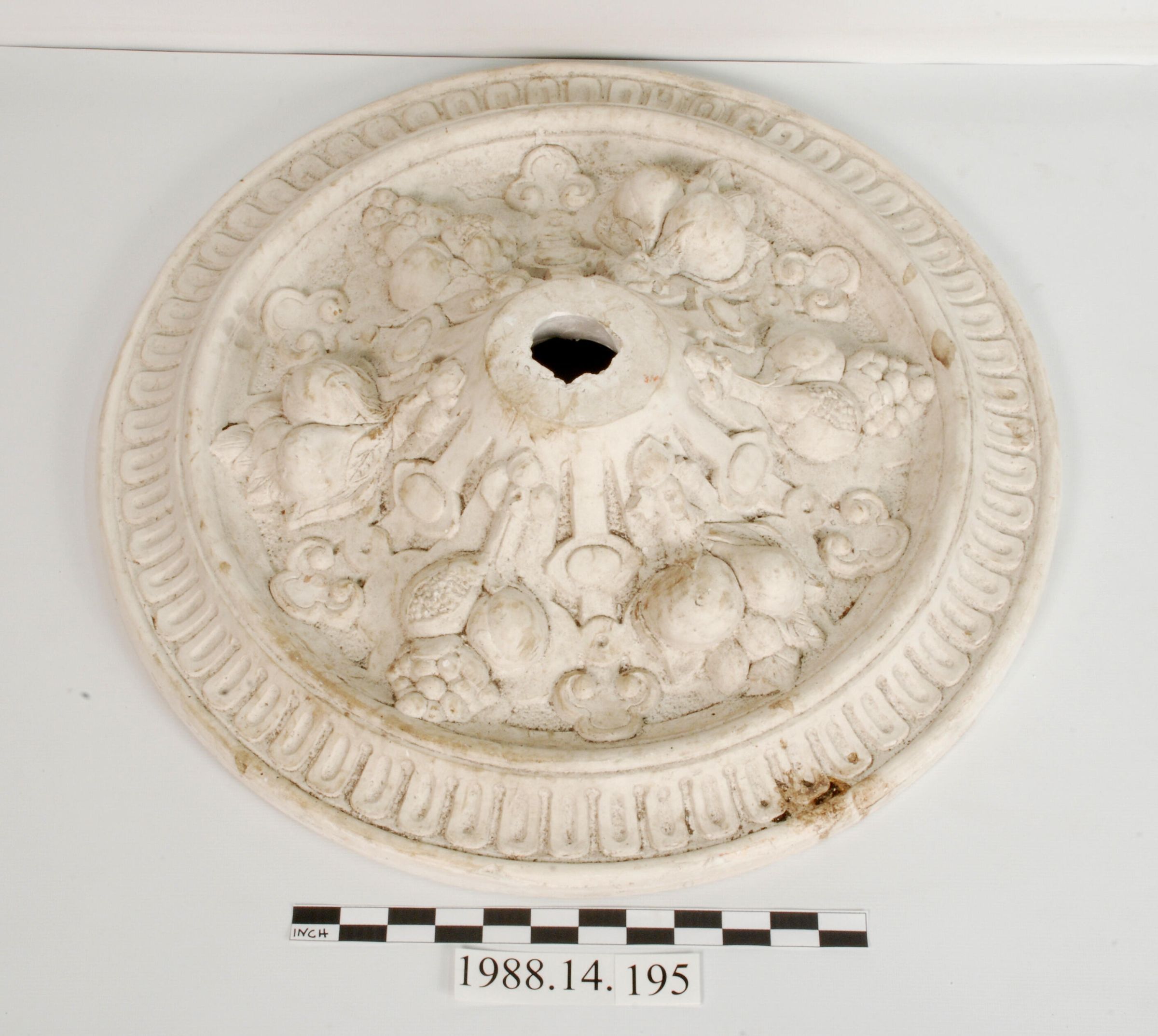 Reproduction molded plaster circular ceiling medallion. Central hole. Fruit / botanical motif. Fluted perimeter.