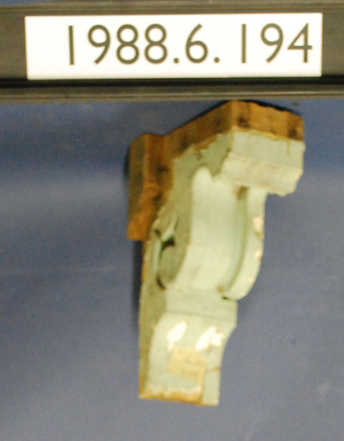 Exterior wood bracket. Compound contour. Painted green. Inscriptions or Markings: Manufacturer: Place of Manufacturer: Design motif: Style: Finish: Painted