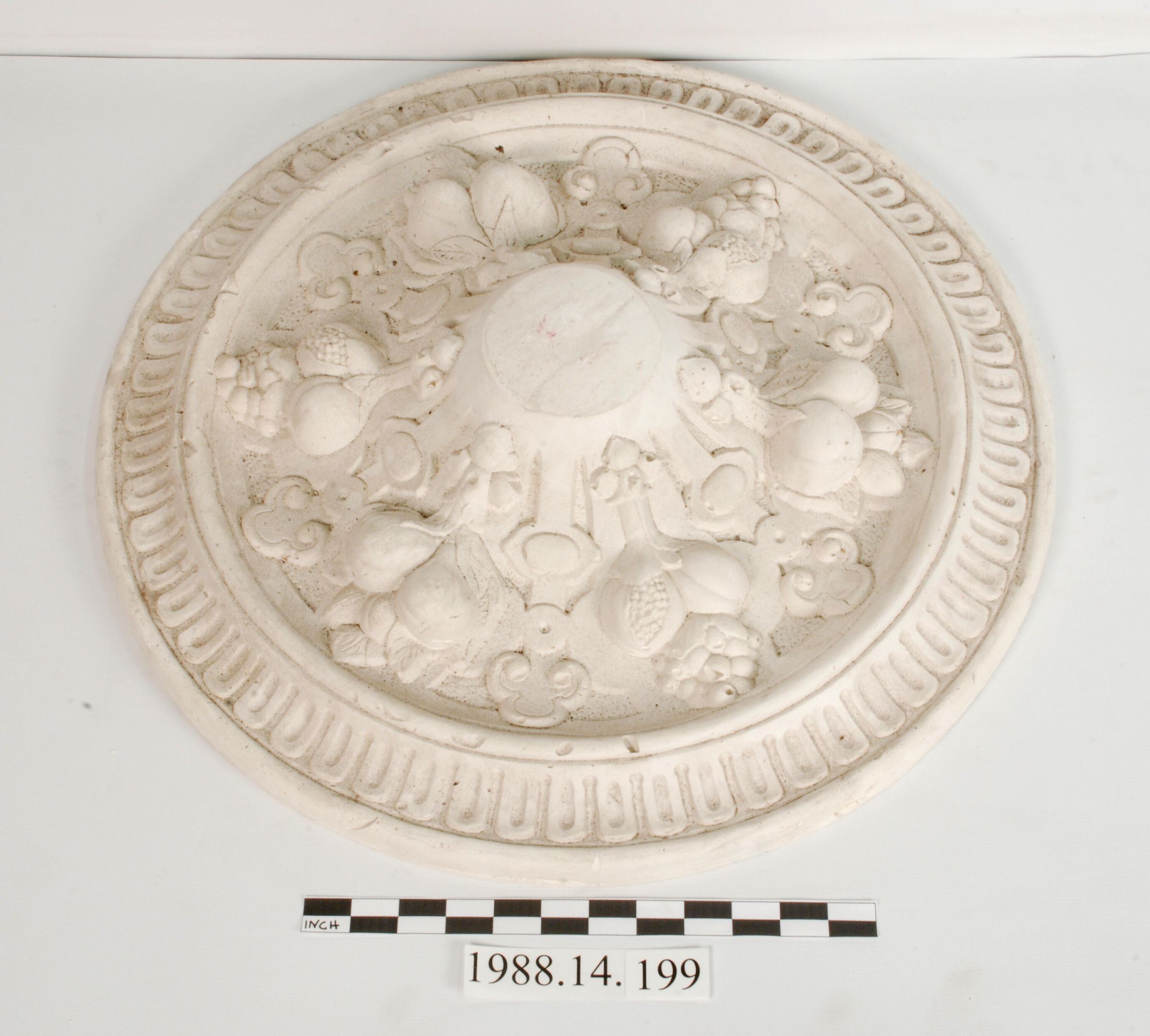 Reproduction molded plaster circular ceiling medallion. Fruit / botanical motif. Fluted perimeter.