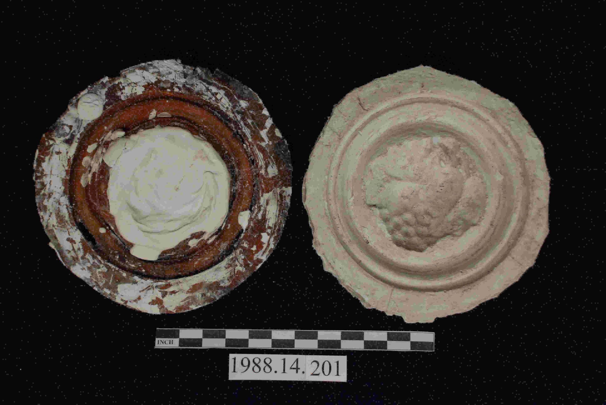 Rubber facing with plaster mother mold to cast ornament. Copied from circular flue-stopper. Fruit motif. Has incomplete casting stuck in mold.