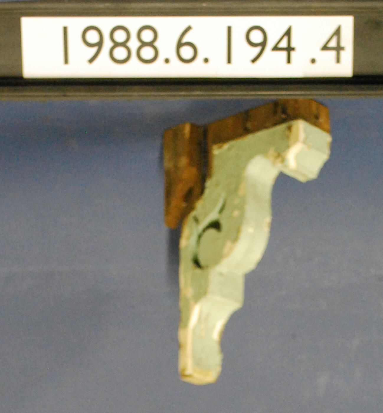 Exterior wood bracket. Compound contour. Painted green. Inscriptions or Markings: Manufacturer: Place of Manufacturer: Design motif: Style: Finish: Painted