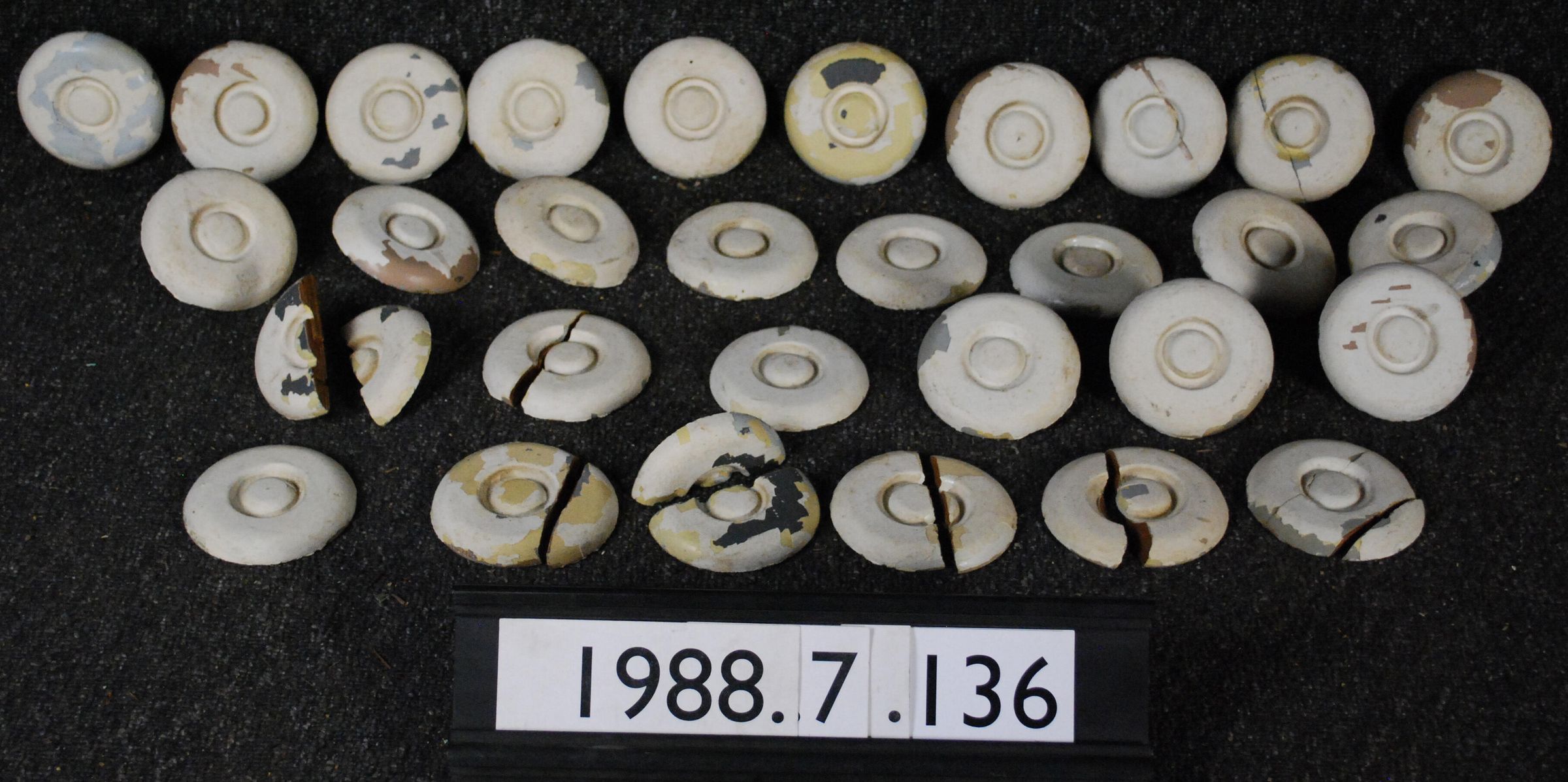One lot of thirty-one interior wood bullseye ornaments, seven are broken. Painted White. Inscriptions or Markings: Manufacturer: Place of Manufacturer: Design Motif: Style: Finish: Painted White