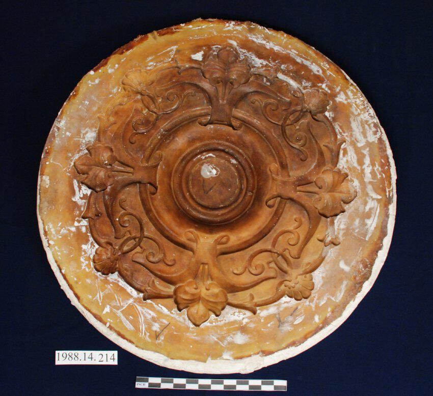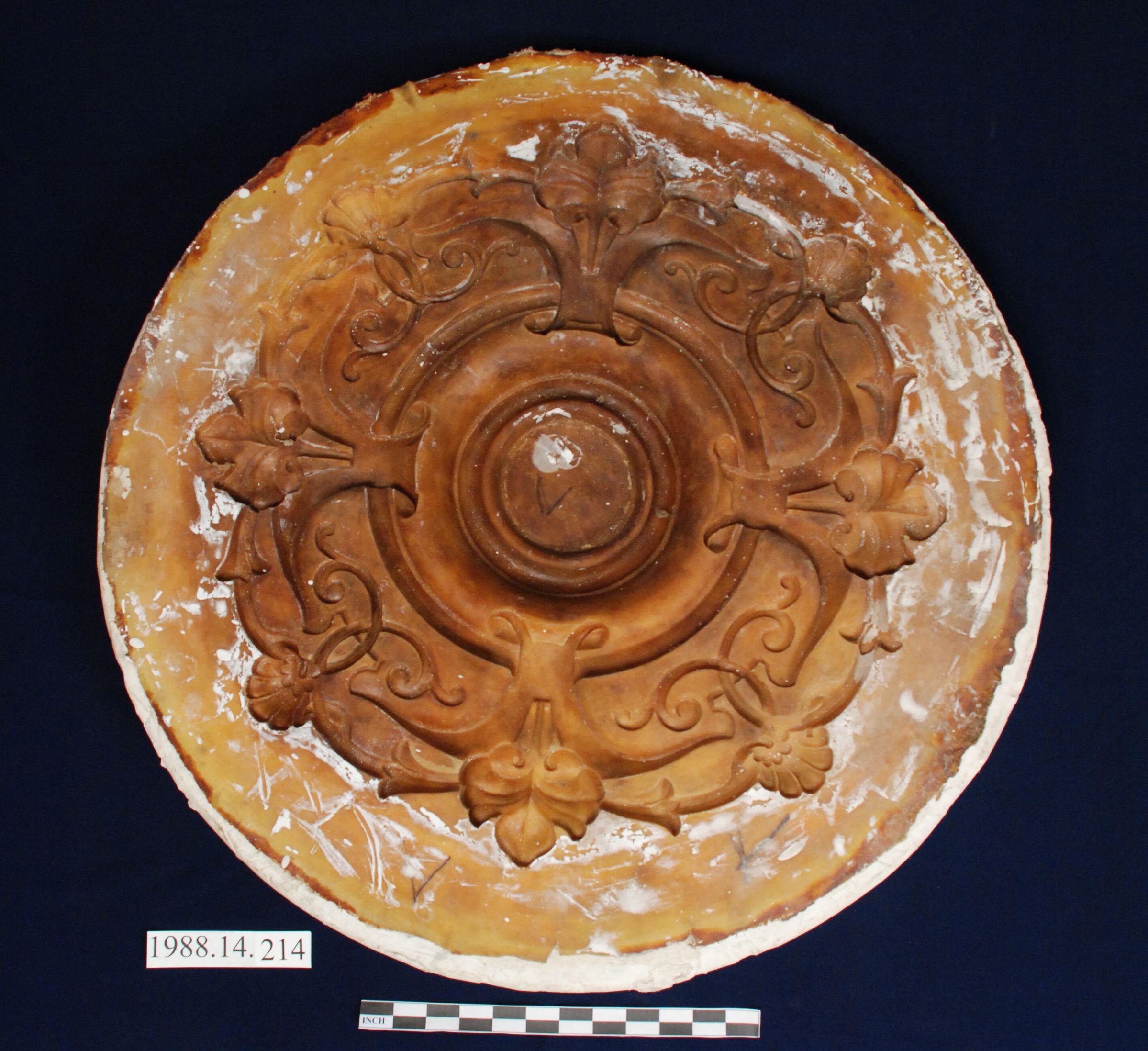 Rubber facng with plaster mold to cast circular ceiling medallion. Scroll / shell / leaf alternating quad pattern.