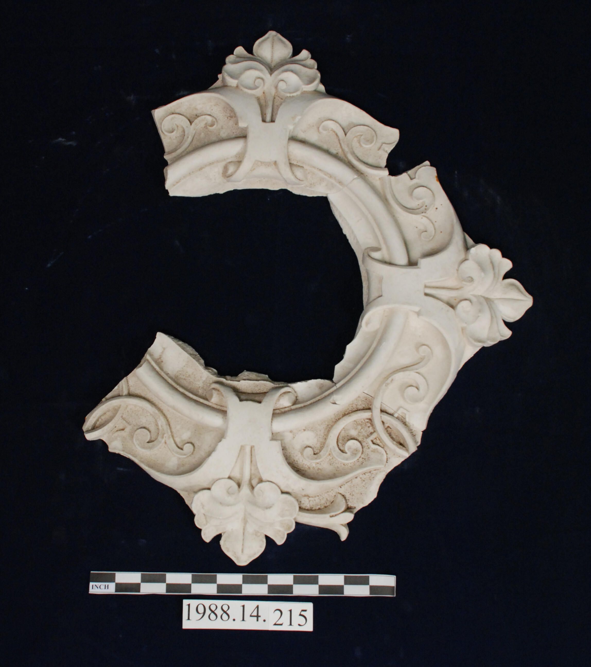 Reproduction molded plaster. Ceiling medallion fragments (incomplete). (See 1988.14.214 mold). Scroll / shell / leaf motif. Three fragments form one medallion.