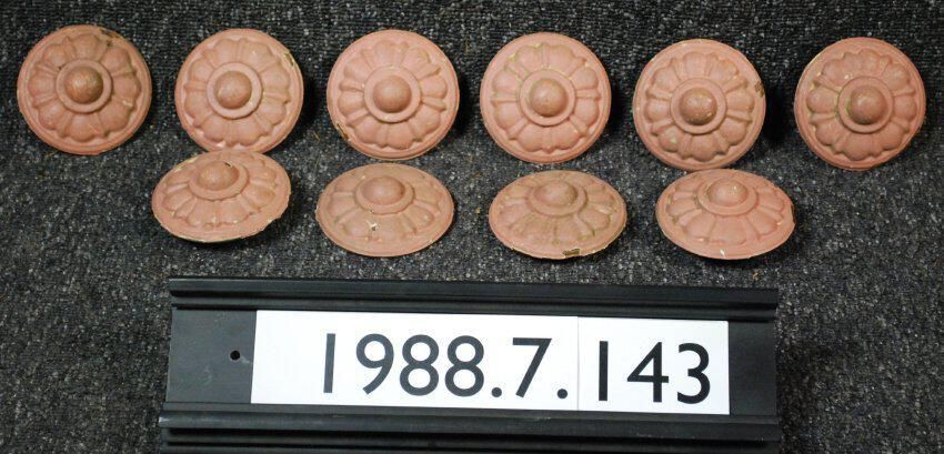 One lot of nine interior wood bullseye ornaments. Made of walnut. Stylized botanical motif. Painted pink. Inscriptions or Markings: Manufacturer: Place of Manufacturer: Design Motif: Stylized Style: Finish: Painted Pink