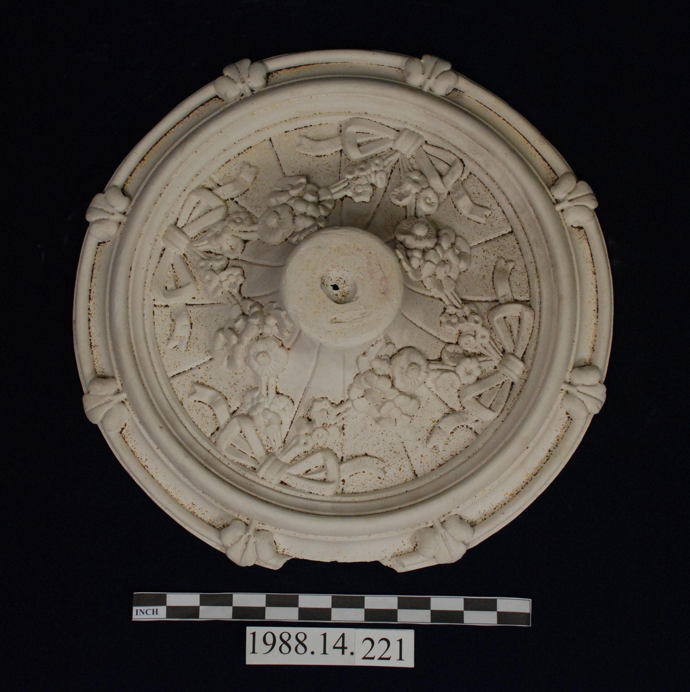 Reproduction molded plaster. Circular medallion with floral and ribbon bow motif. Has motif with series of leaves around perimeter. (About four inch long missing piece).
