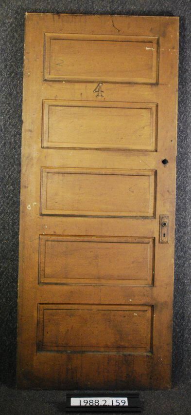Five--panel door. Has mortise lock and two back plates. Metal HUMERAL 4 (room number). All other hardware is missing. Painted reddish brown on both sides. Matches 1988.2.156 and 158.