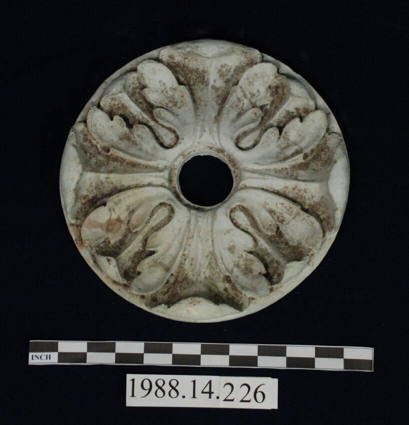 Reproduction molded plaster. Circular medallion. Central hole. Ancanthus leaf motif. Plaster tinted green.