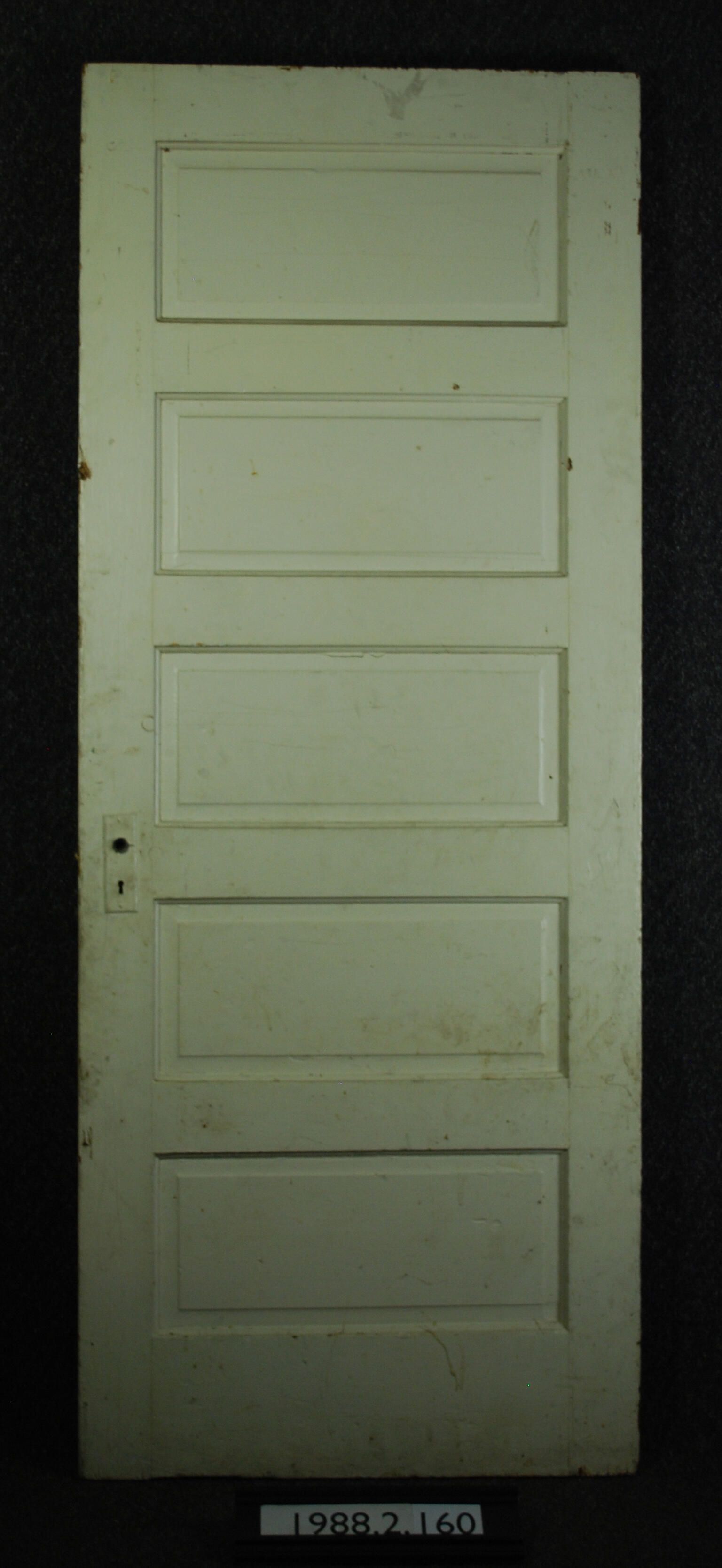Five--panel door. Has mortise lock and two back plates. One hinge leaf. One hinge missing. Painted off-white / cream colored on both sides. Matches 1988,2,161 abd 162,