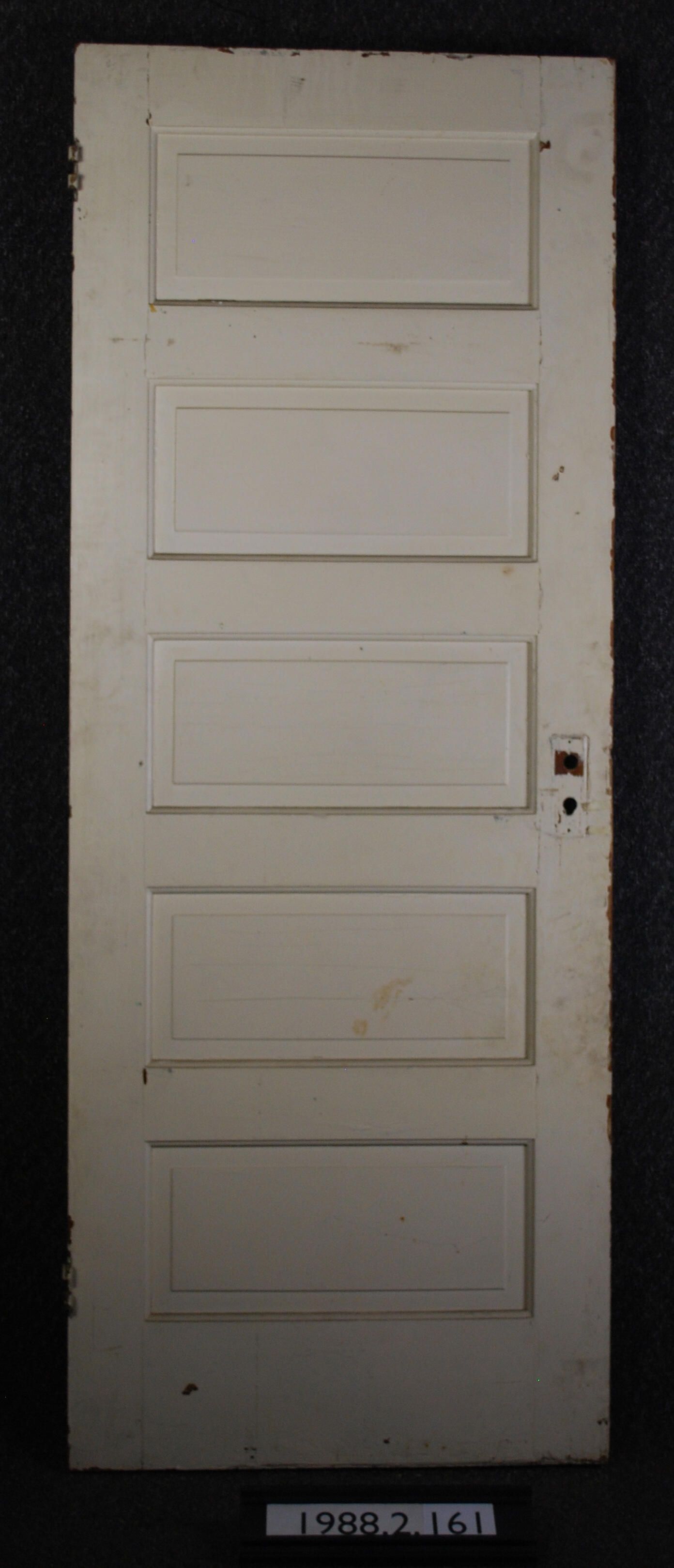 Five--panel door. Mortise lock is missing. Back plates are missing. Two hinge leaves. Painted off-white / cream colored on both sides. Matches 1988.2.160 and 162.