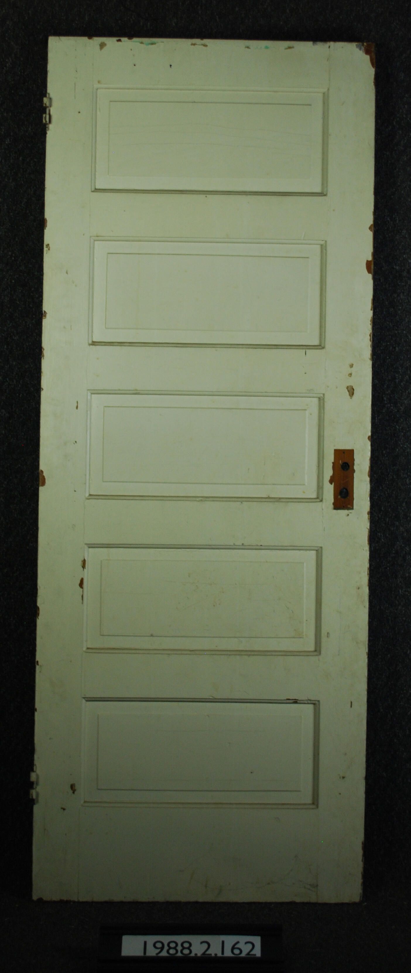 Five--panel door. Mortise lock is missing. Back plates are missing. Two hinge leaves. Painted off-white / cream colored on both sides. Matches 1988.2.160 and 161.