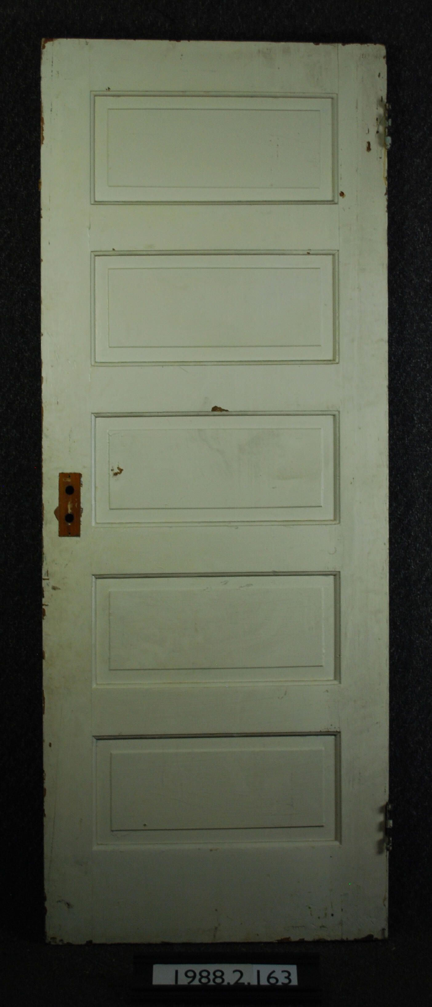 Five--panel door. Mortise lock is missing. Has two hinge leaves. All other hardware is missing. Painted off-white /on both sides.
