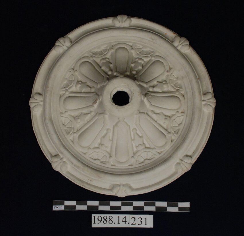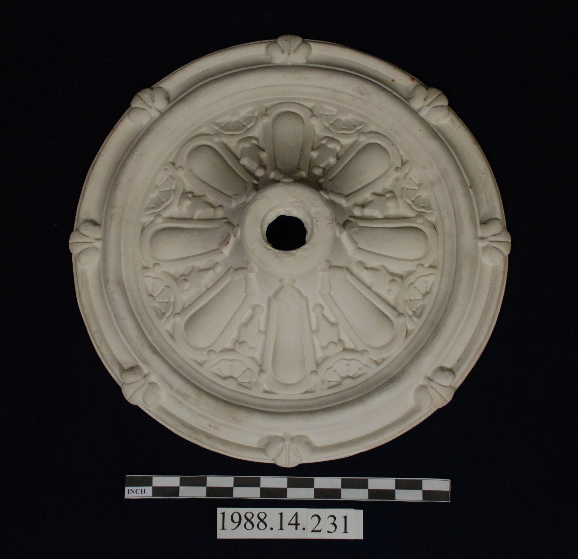 Reproduction molded plaster. Circular medallion. Leaf motif around perimeter. Center has rosette with geometric motif.